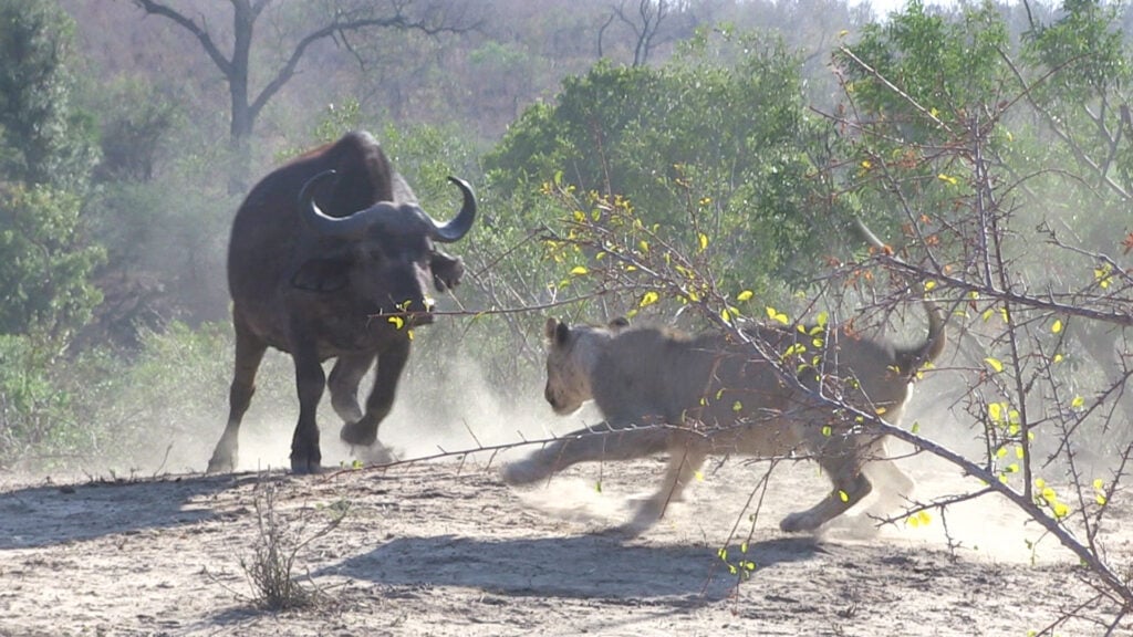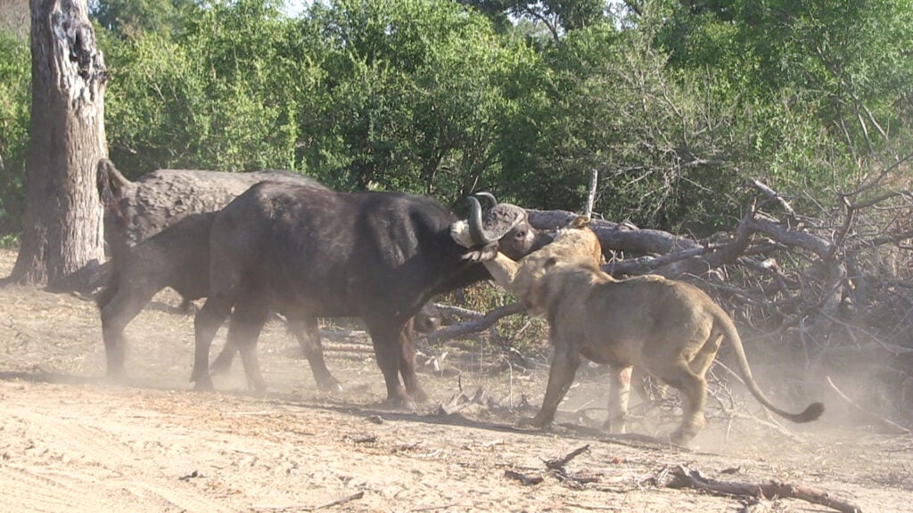 The unlucky lion that had gone for the neck found itself catapulted down to the ground by the angry buffalo, where it was facing the very real risk of being gored by the buffalo’s large horns.