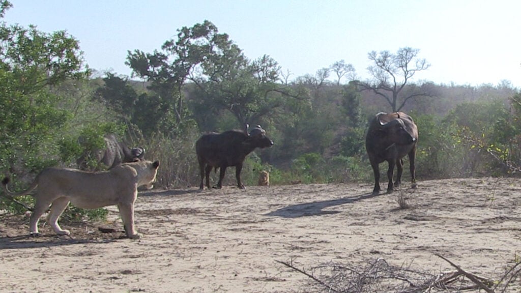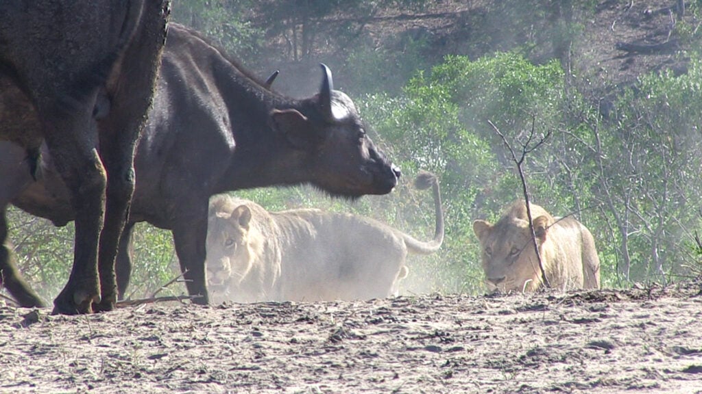 With a third buffalo lumbering over, and the odds rapidly worsening, the lions recognized the need to retreat and regroup. Their plan wasn’t working, but they weren’t quite ready to cut their losses and leave just yet.