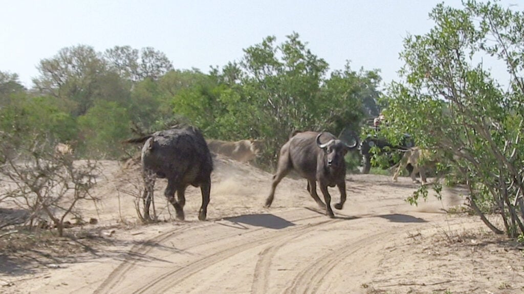 This game eventually ended in a standoff, the lions didn’t have the time to bring down one buffalo before the others intervened to save it, and the buffalo didn’t have the speed to escape the hunting lions without being chased.
