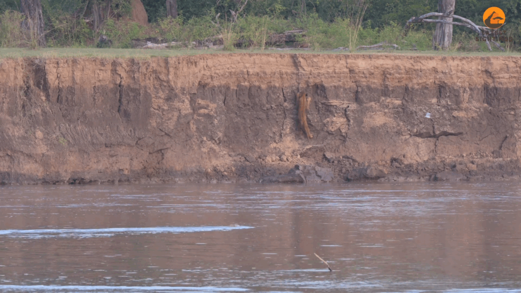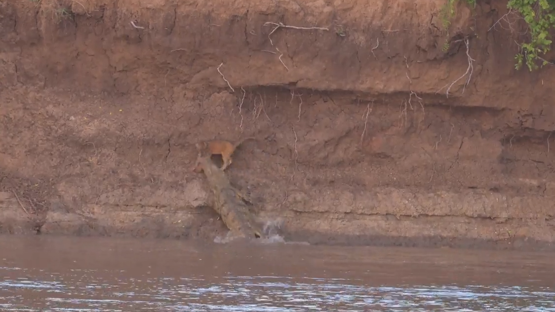 Using its sharp claws it was able to make it halfway up the face of the cliff, but a more serious problem was emerging. The hippos were snapping at its heels as it fell and made its way through the water, but there were other threats lurking beneath the waves.