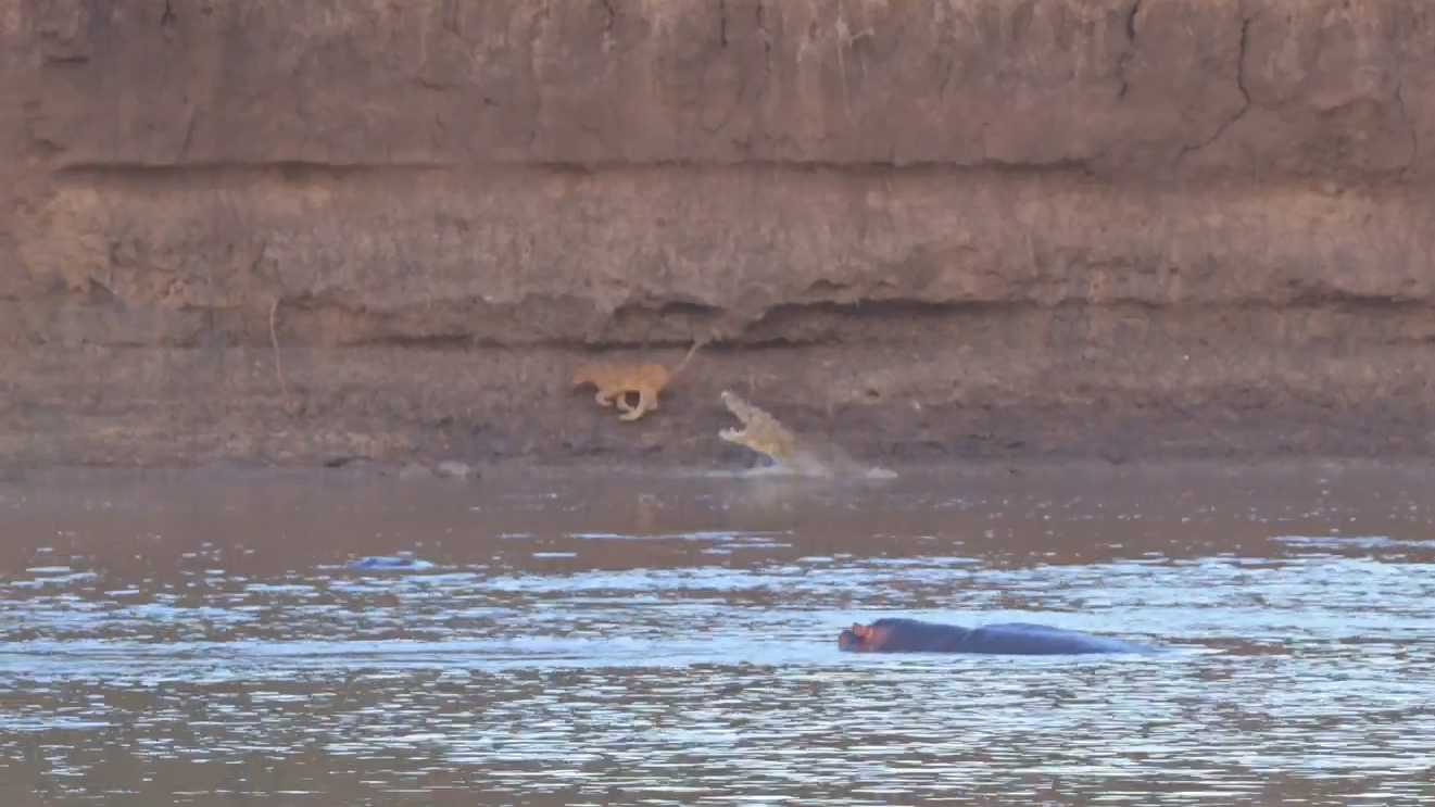 Murky waters like these are typically a source of serious threats, even for ferocious fully grown apex predators. One of these threats made itself known shortly into the footage, as a huge hippo attacked.