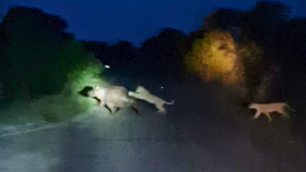 Its massive body was moving with surprising speed. Hot on its heels, four lionesses burst out from the bush, eyes gleaming with predatory focus in the night.