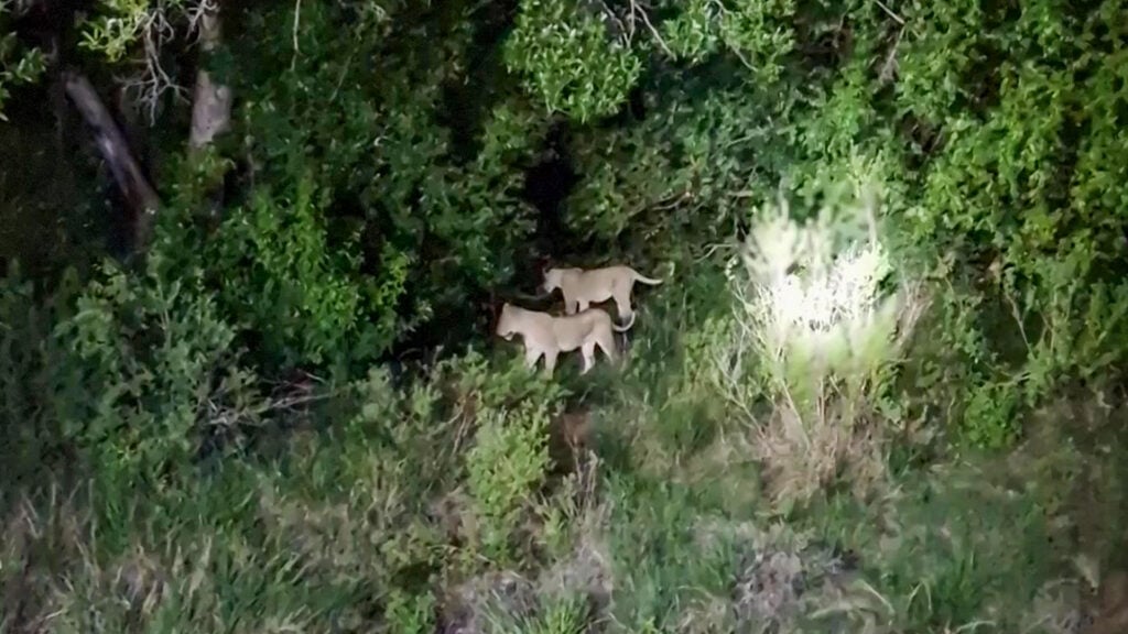 In the midst of the action, a voice from the safari vehicle cut through the excitement: “I got that on camera!”. As two more lionesses joined the road, the first pair and their prey disappeared into the thick bush on the other side.