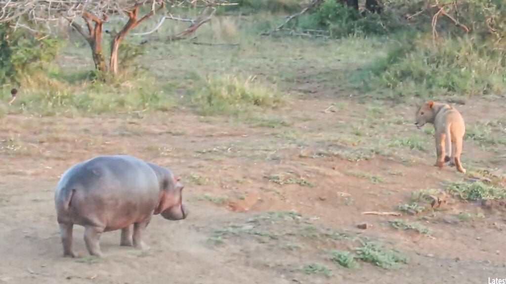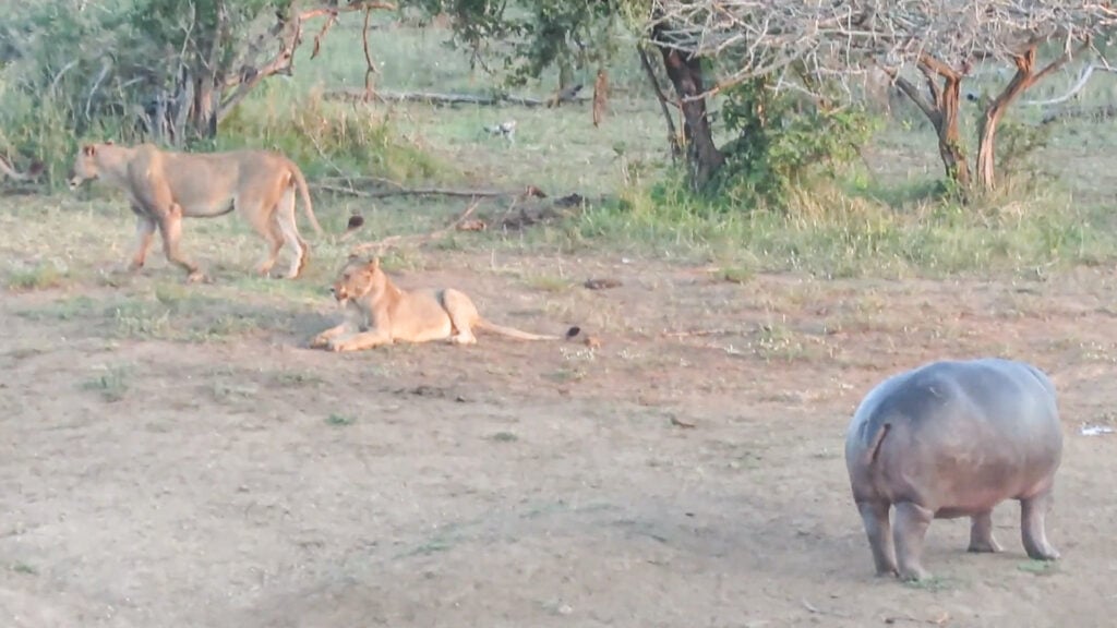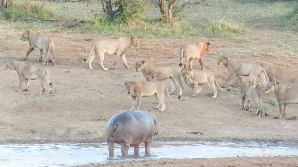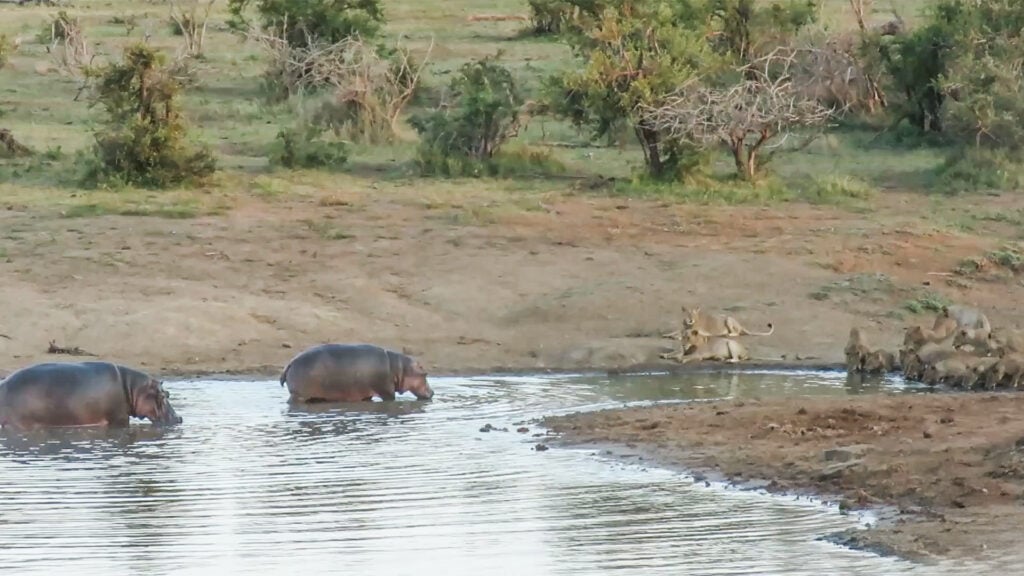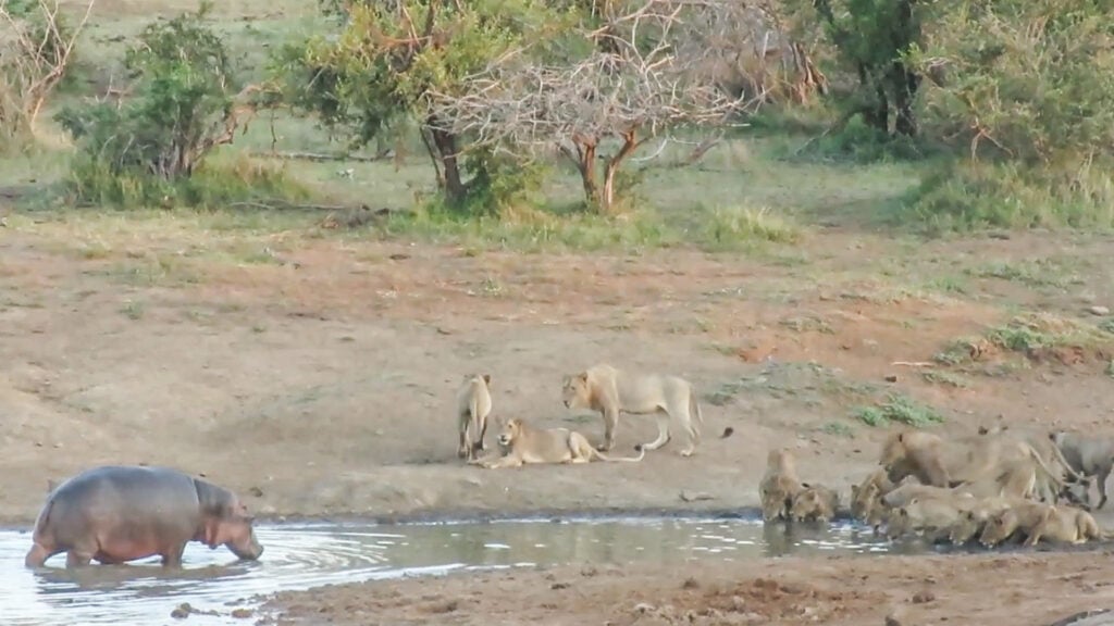 The drama didn’t end there though. With the lions now regrouped a few meters from the water’s edge, the hippo continued her pursuit.