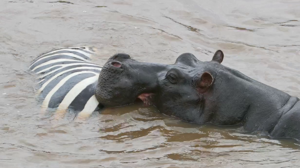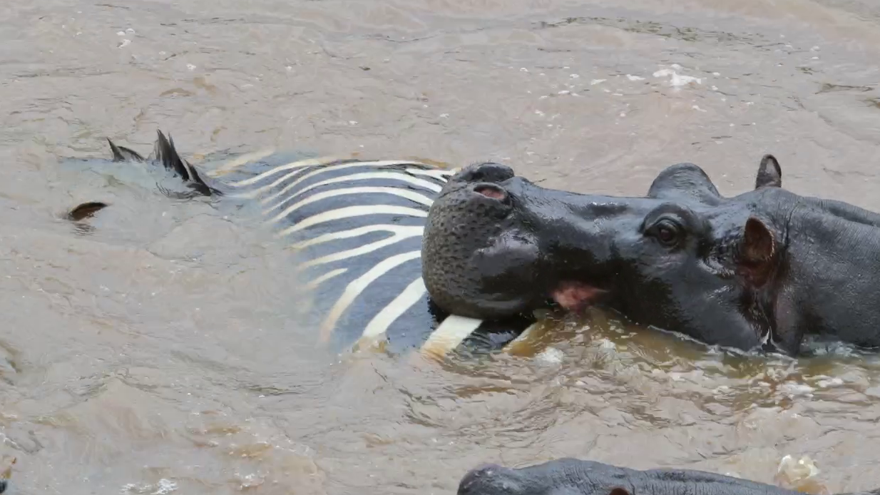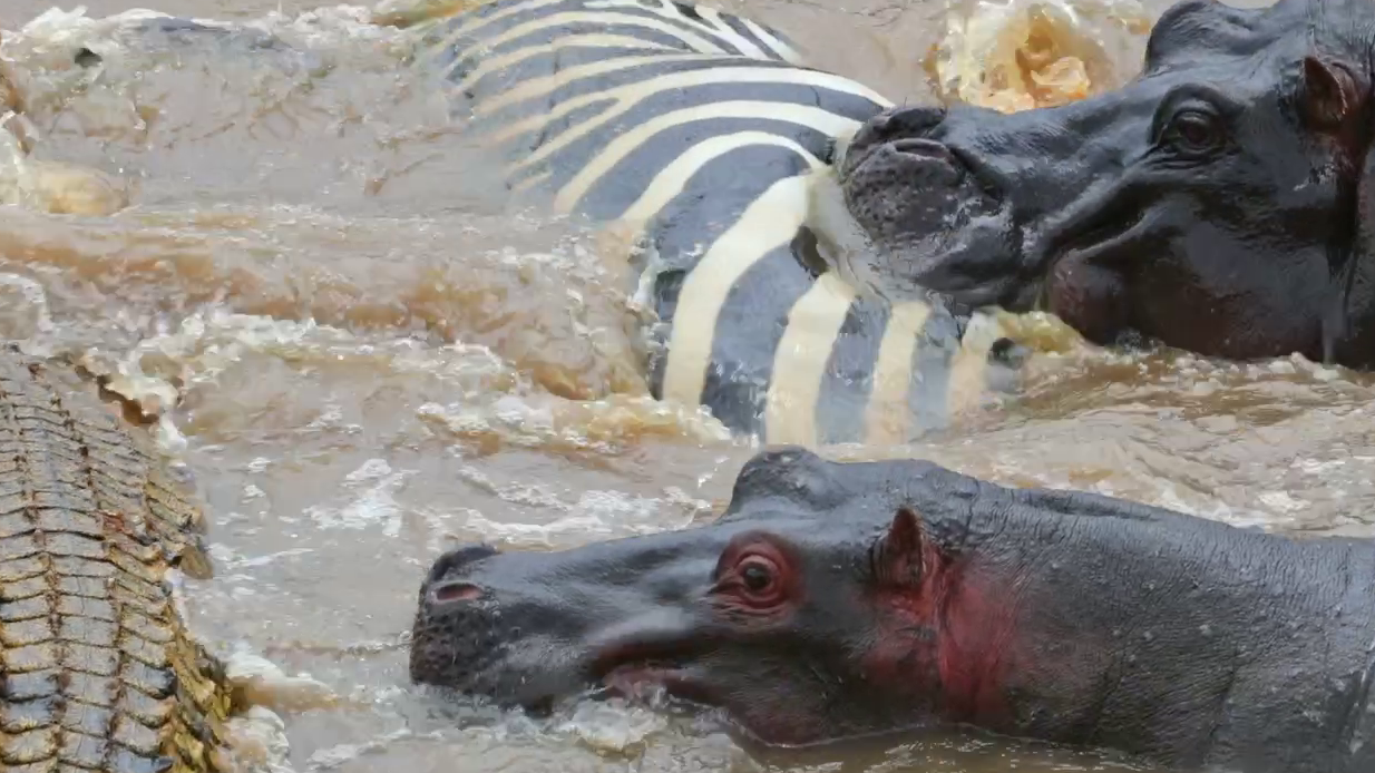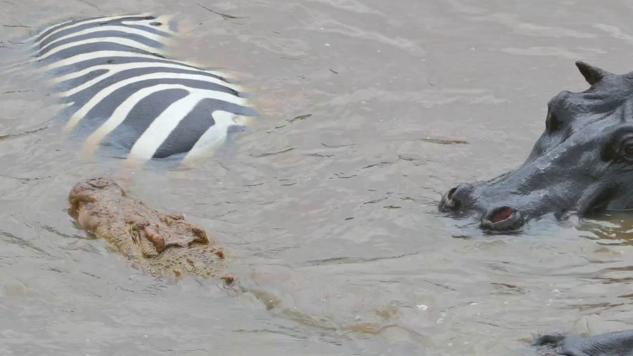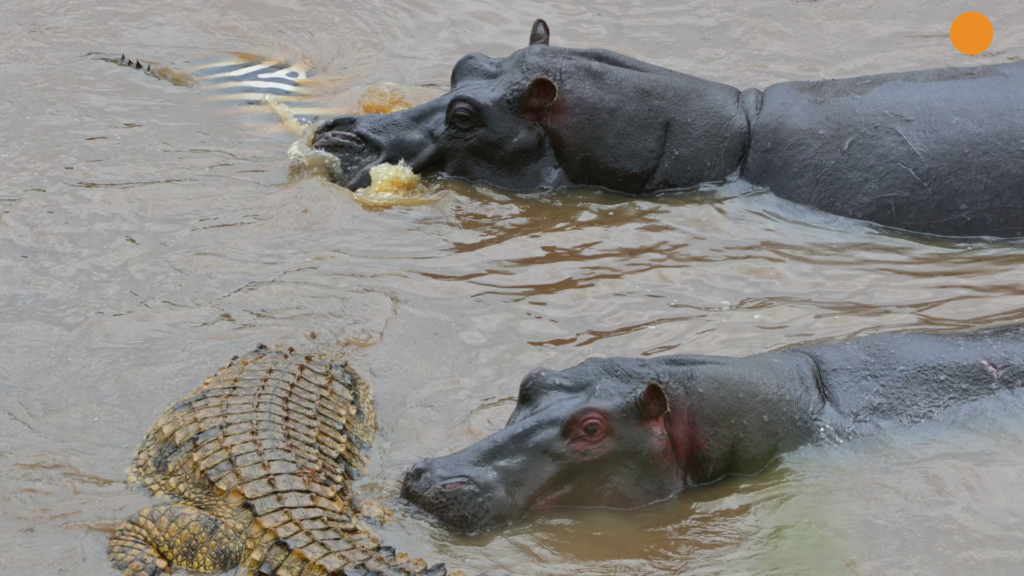 The croc’s head is under the water, presumably tearing at the zebra’s flesh. Unusually, the larger hippo, presumably the mother of the second hippo, also appears to be chewing on the zebra. Meanwhile, the smaller hippo seems most interested in the crocodile.