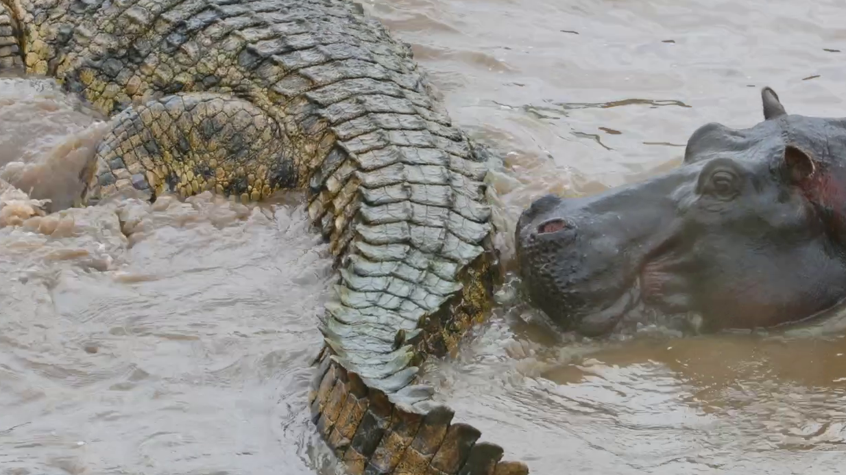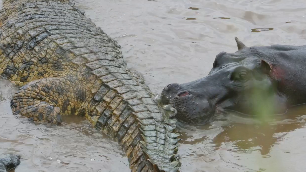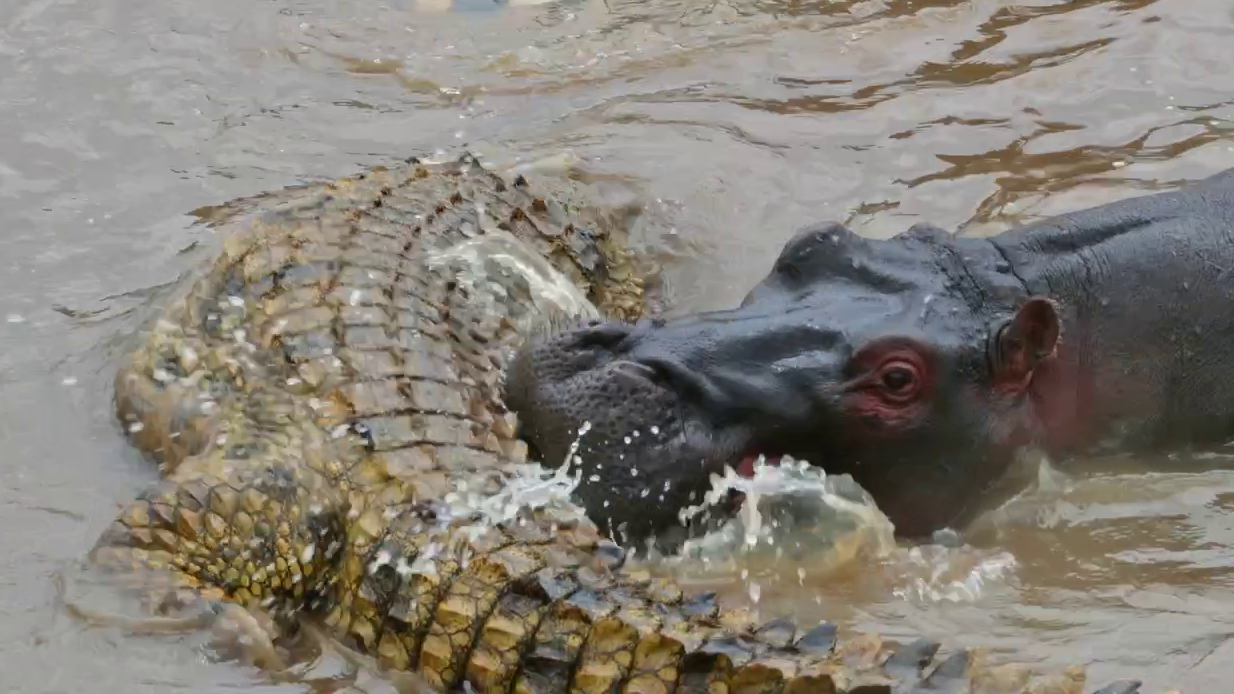 In the inland waters of Africa, an uneasy truce exists between hippos and crocodiles. While they share an aquatic environment, one is a carnivore, and the other is a herbivore. Well, most of the time.