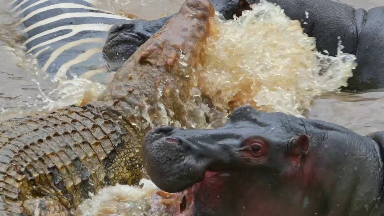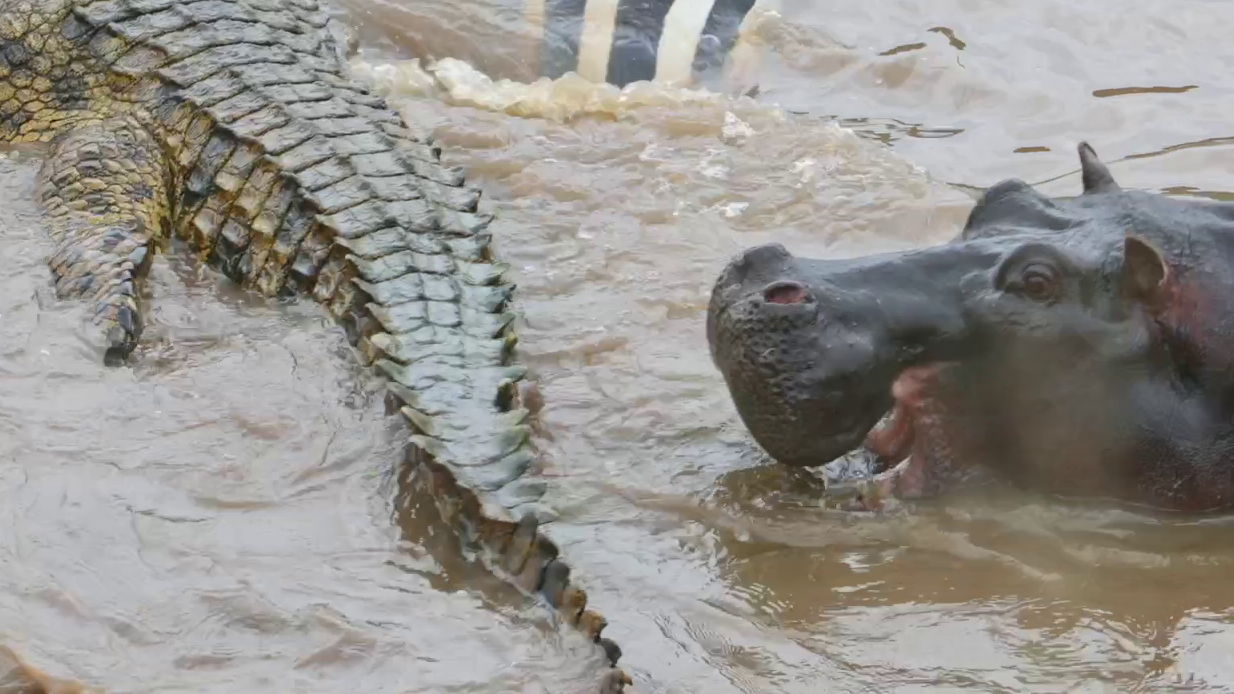 Then, when it too moved in to feed, the smaller hippo once again took exception to its presence. With the croc preoccupied, the hippo moved in behind it.