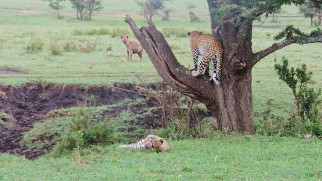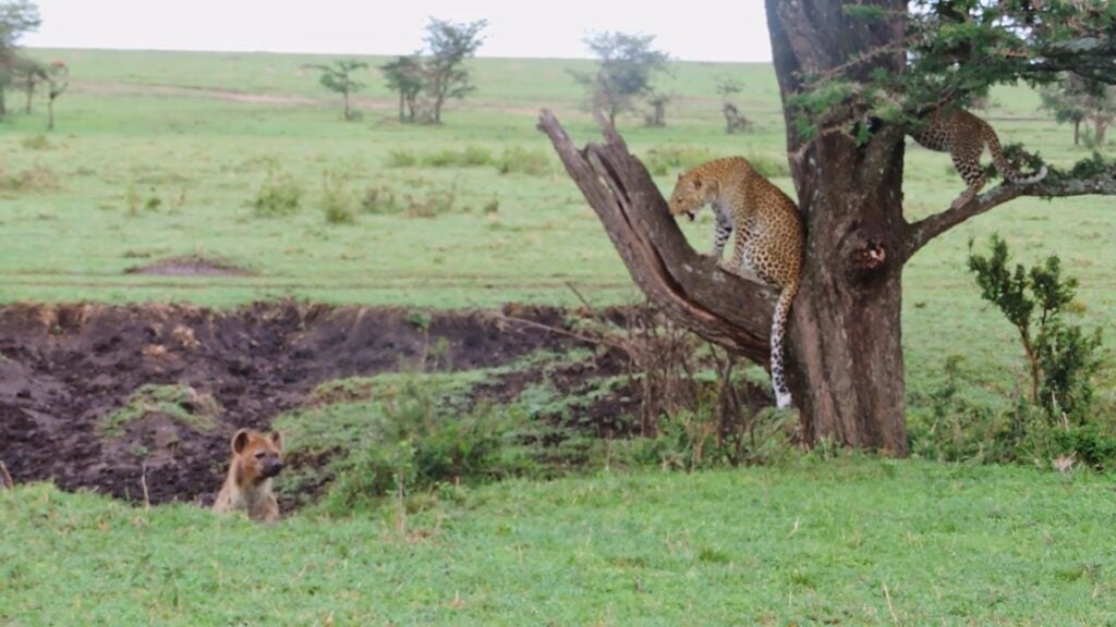 It didn’t take long for one of these incoming threats to appear. Perhaps the leopard cub’s mother had already noticed two hyenas on approach, and went into the tree to be better able to keep an eye on them.