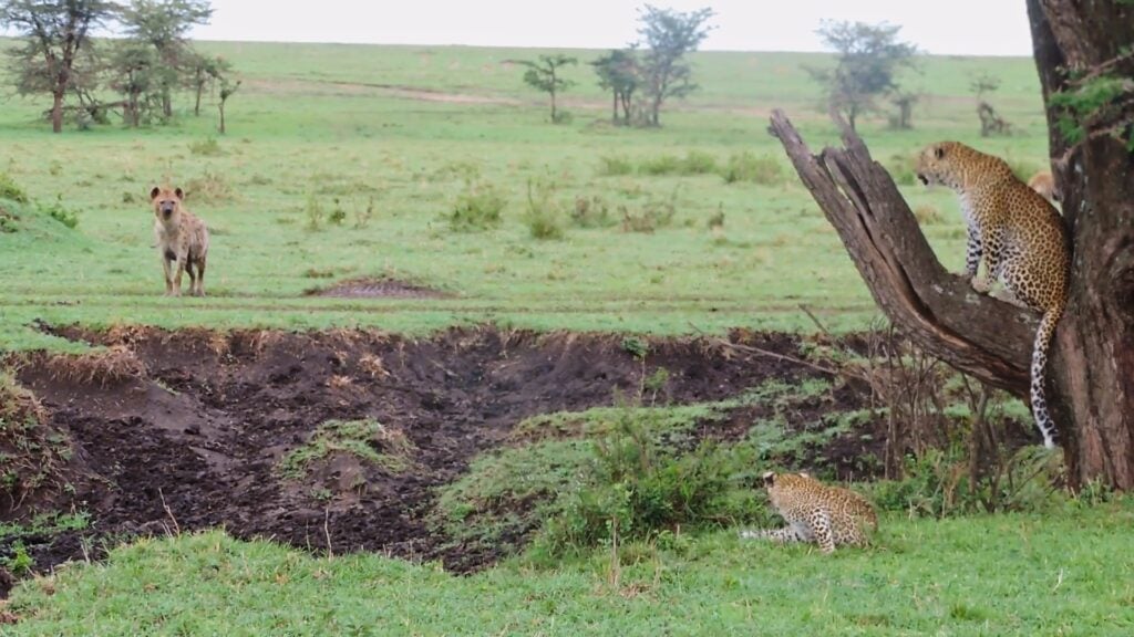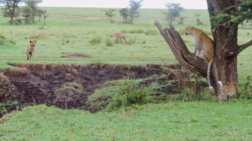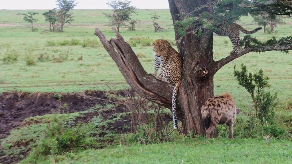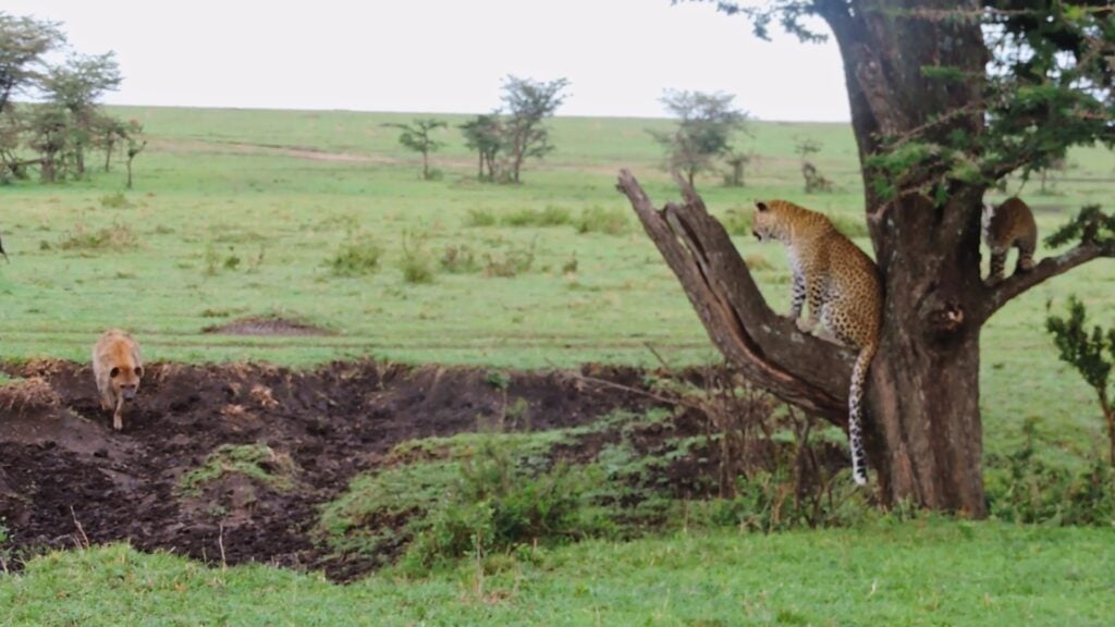 Only one of the hyenas was approaching at first, and it gave the tree with an angry adult leopard in it a wide berth. The mother began to hiss and snarl as it came closer, warning it to stay away, and thankfully the cub realized something was wrong and leapt up into the tree.