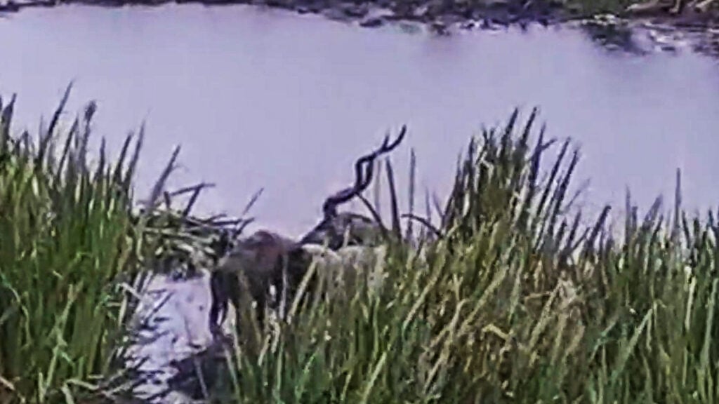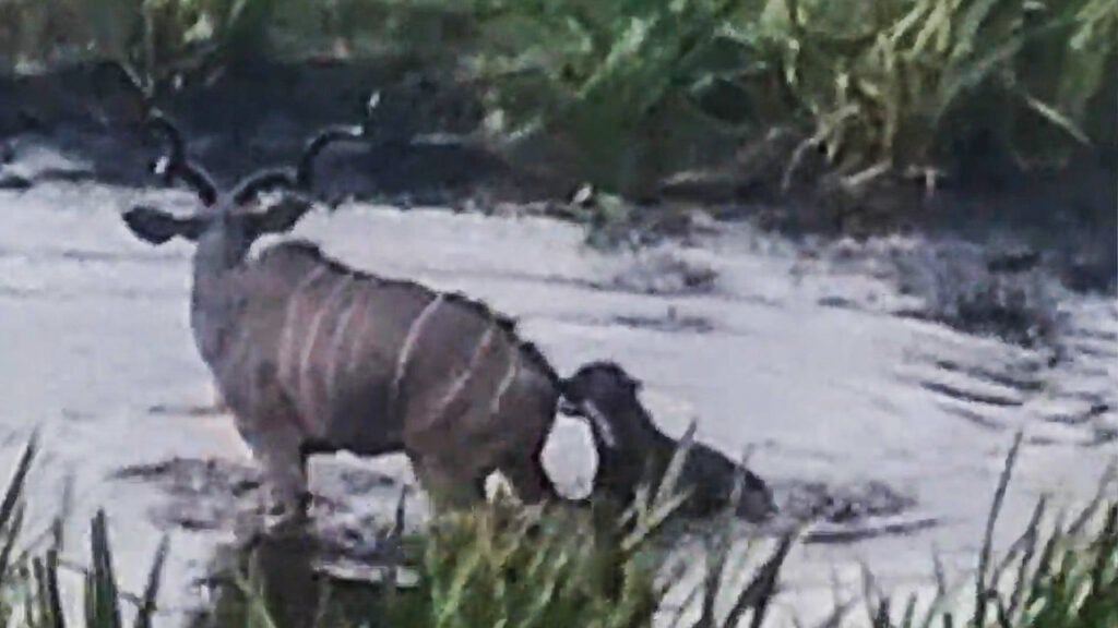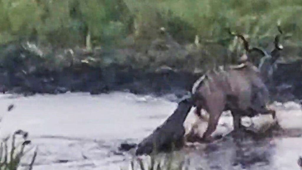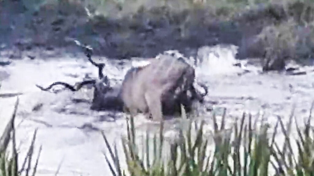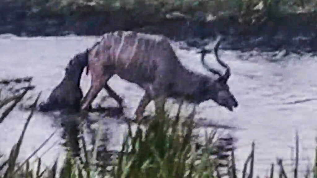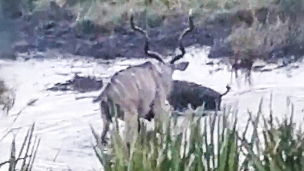 The hyena is relentless, however, and doesn’t let go. Eventually, the kudu’s tail is torn off in the struggle, blood marking the muddy water and signalling the beginning of the end.
