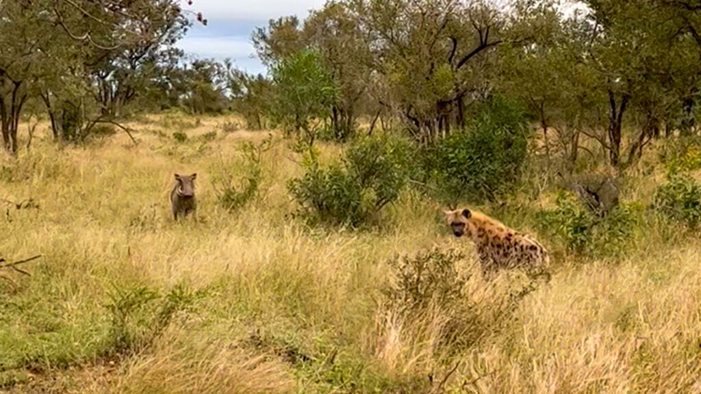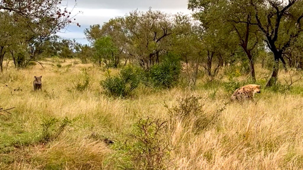 Along the H4-2, close to Numbi Gate in Kruger National Park, Marine Kruger and fellow safari-goers found themselves watching what felt like the calm before a storm. Two hyenas stood partially concealed in tall grass, their ears upright and their eyes fixed on a lone warthog.