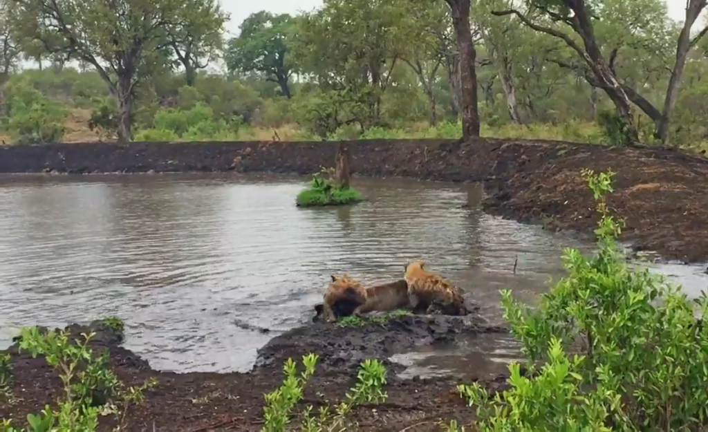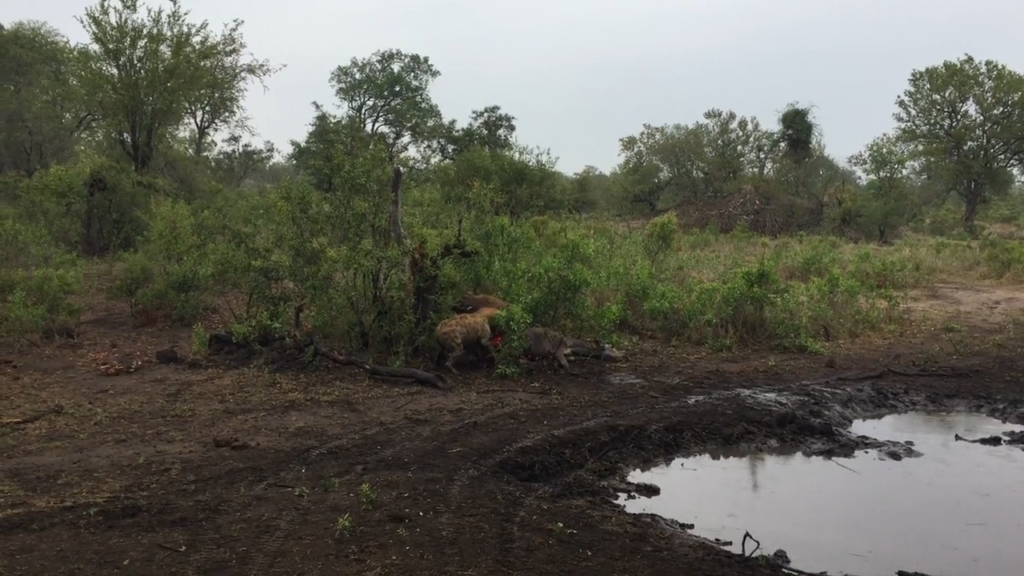 These hyena successfully dragged their large prey onto the banks of the waterhole where they settled alongside some bushes and reeds. Here, they finished their kill.
