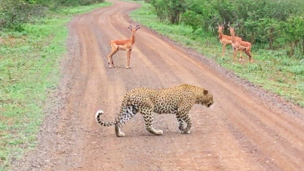As Gaurav’s camera follows the leopard’s crossing, two more impalas are revealed on the other side of the road. They stand perfectly still, eyes locked on the leopard, seemingly ready to flee at a moment’s notice.