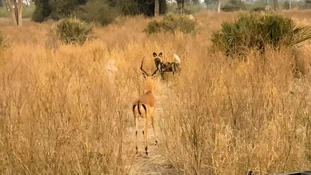 The wild dog encircled the antelope, eventually taking it on from the back. However, the buck was fast with its reaction times and held out its horns in defense.