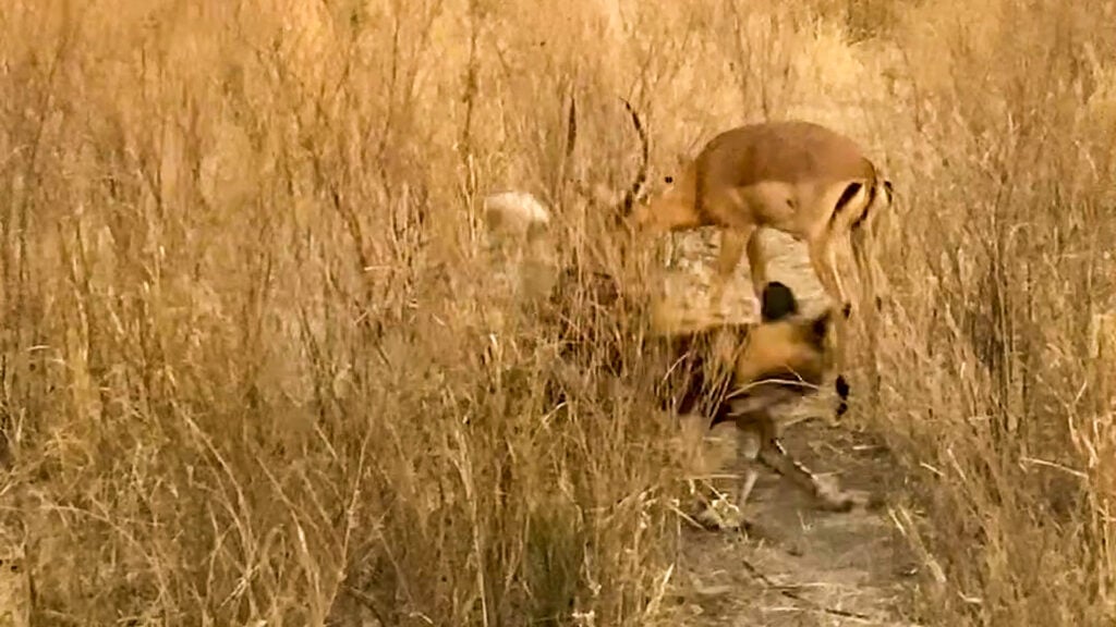 The wild dog was relentless in trying to get close to the buck. However, the impala was equally determined. It had a set of horns on its head and it knew what to do with them!