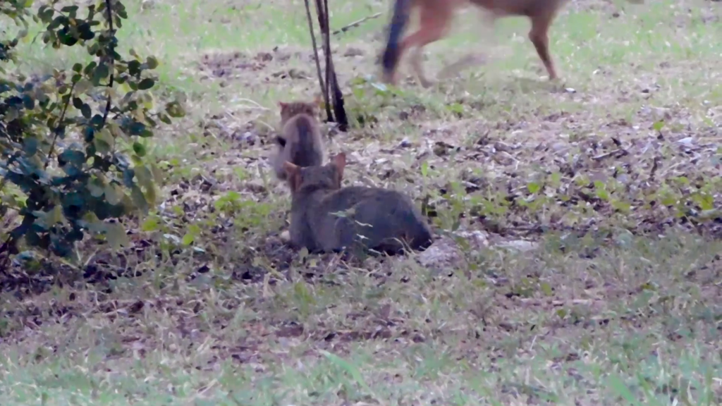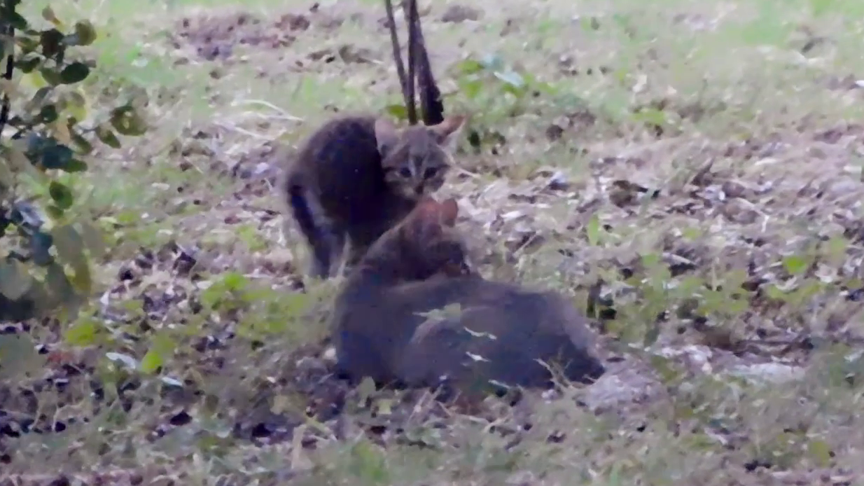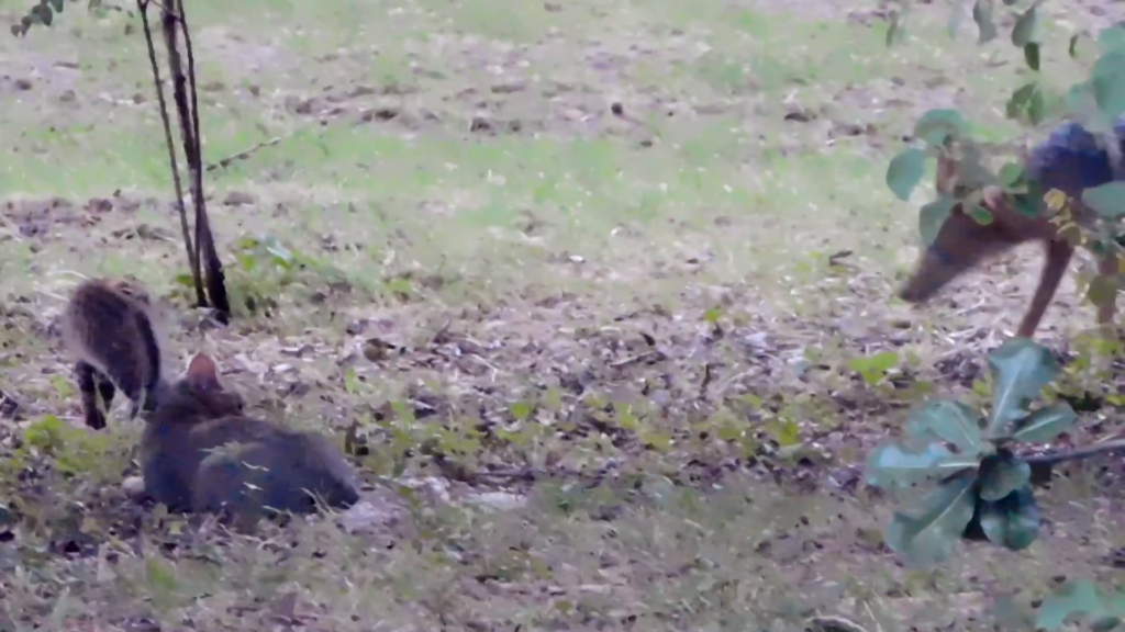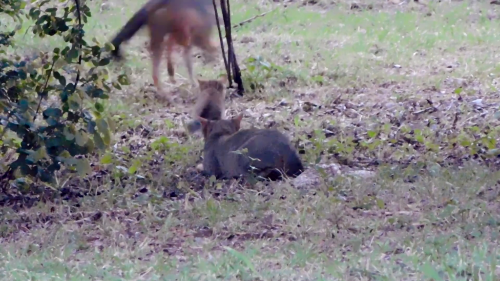Surprisingly, the mother wildcat stays put. Presumably, she recognises that the threat is minimal and an opportunity for her kitten to learn a valuable lesson.