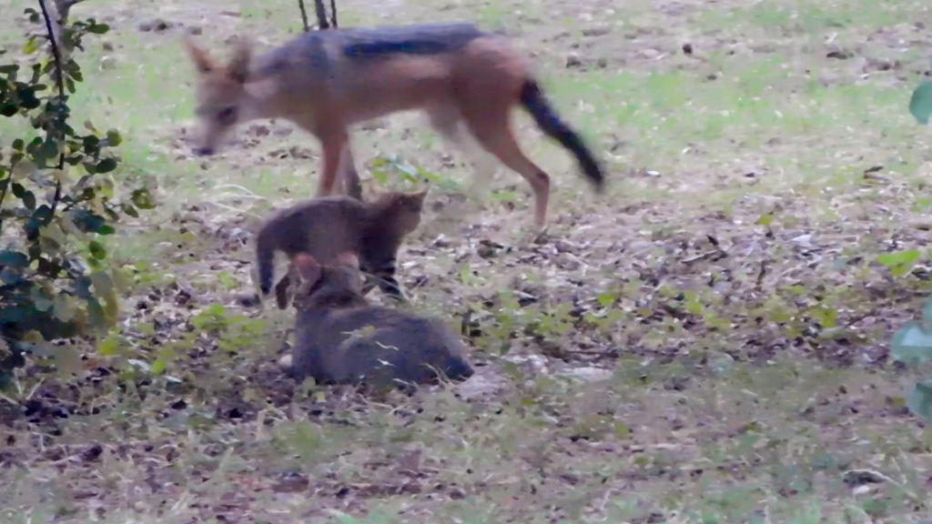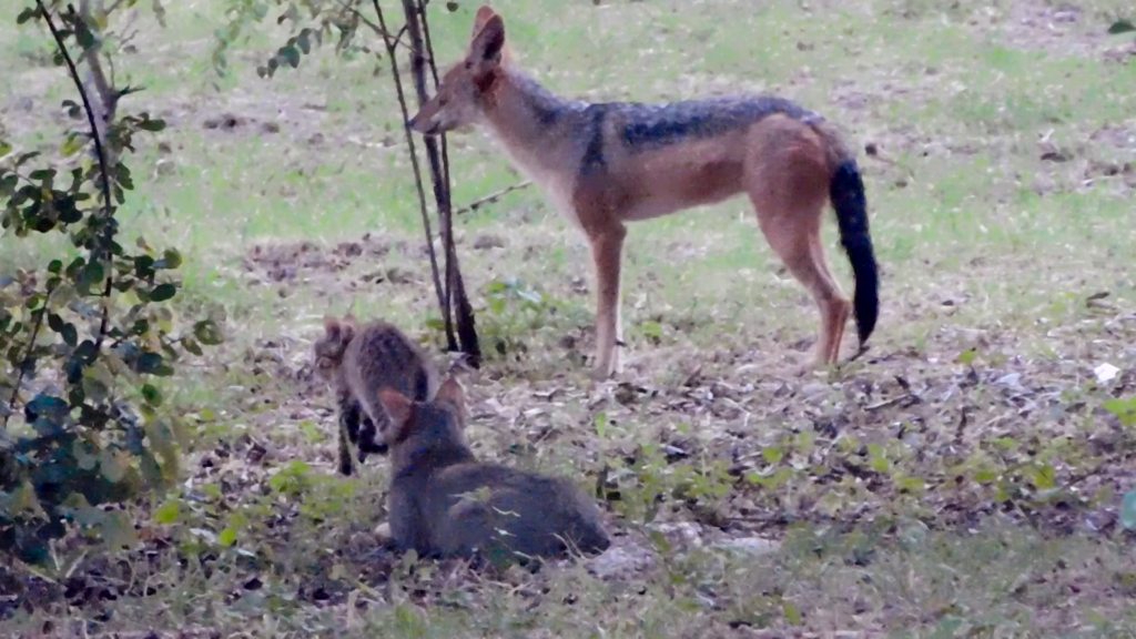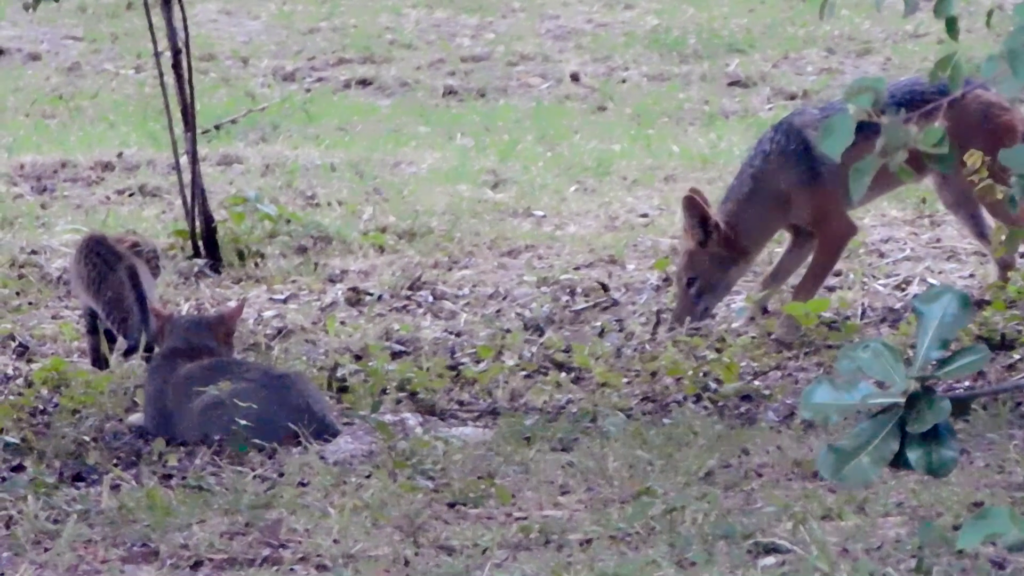 Meanwhile, the jackal is still unsure, and at one point, it disappears from view. It is only at this point that the kitten turns to it’s mother.