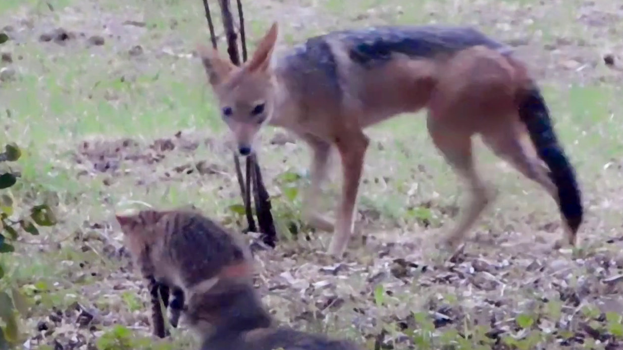 We notice the kitten looks nervous, and, moments later, we find out why. A black-backed jackal comes into view, clearly interested in the little one.