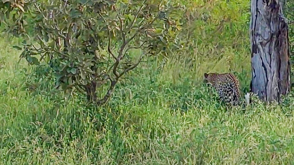 It was already a beautiful drive on a clear day in Kruger National Park when Jacques Smith and his family came to a stop along a dusty road. Nothing dramatic seemed to be unfolding at first glance, just a leopard standing near the roadside, utterly absorbed in something hidden inside a thick bush.