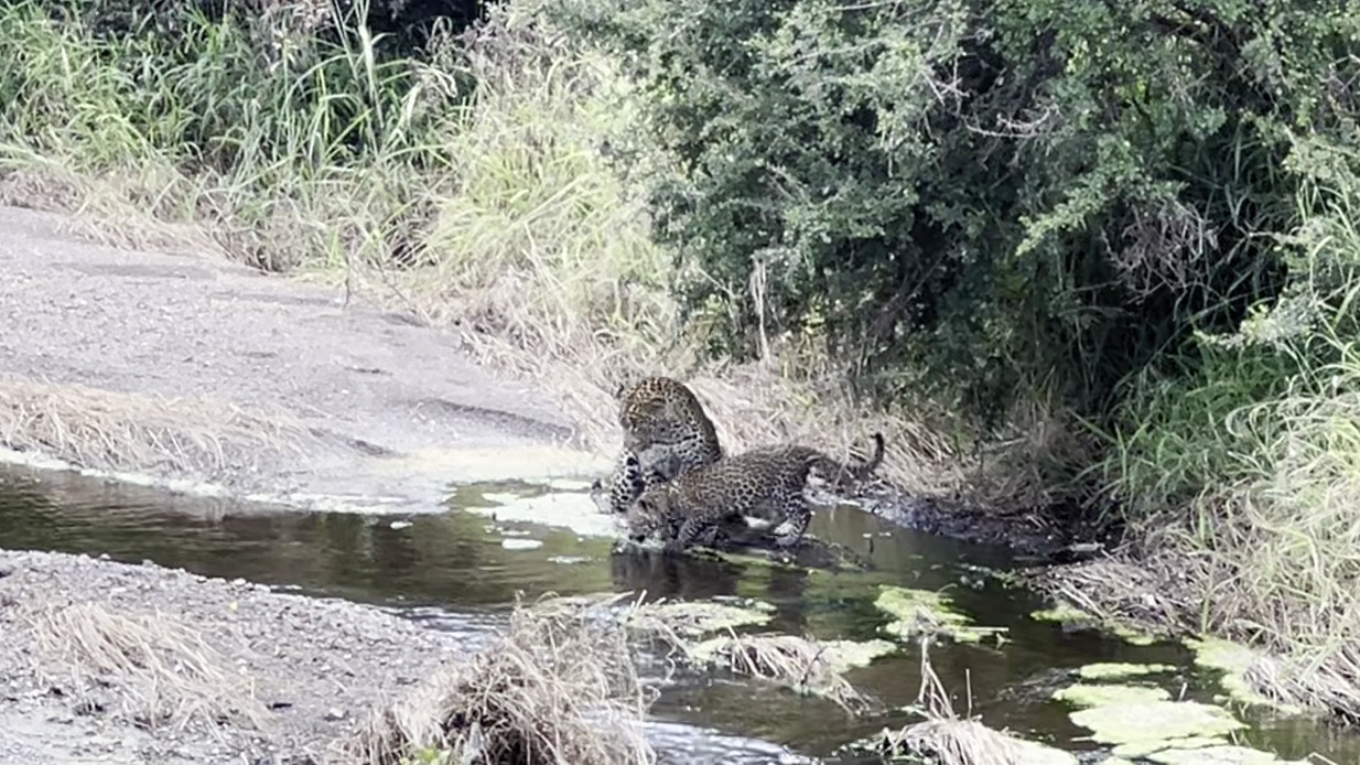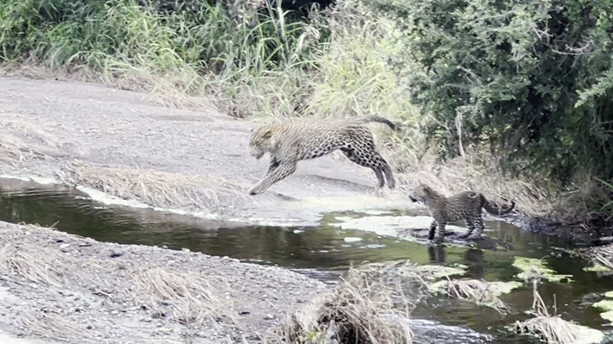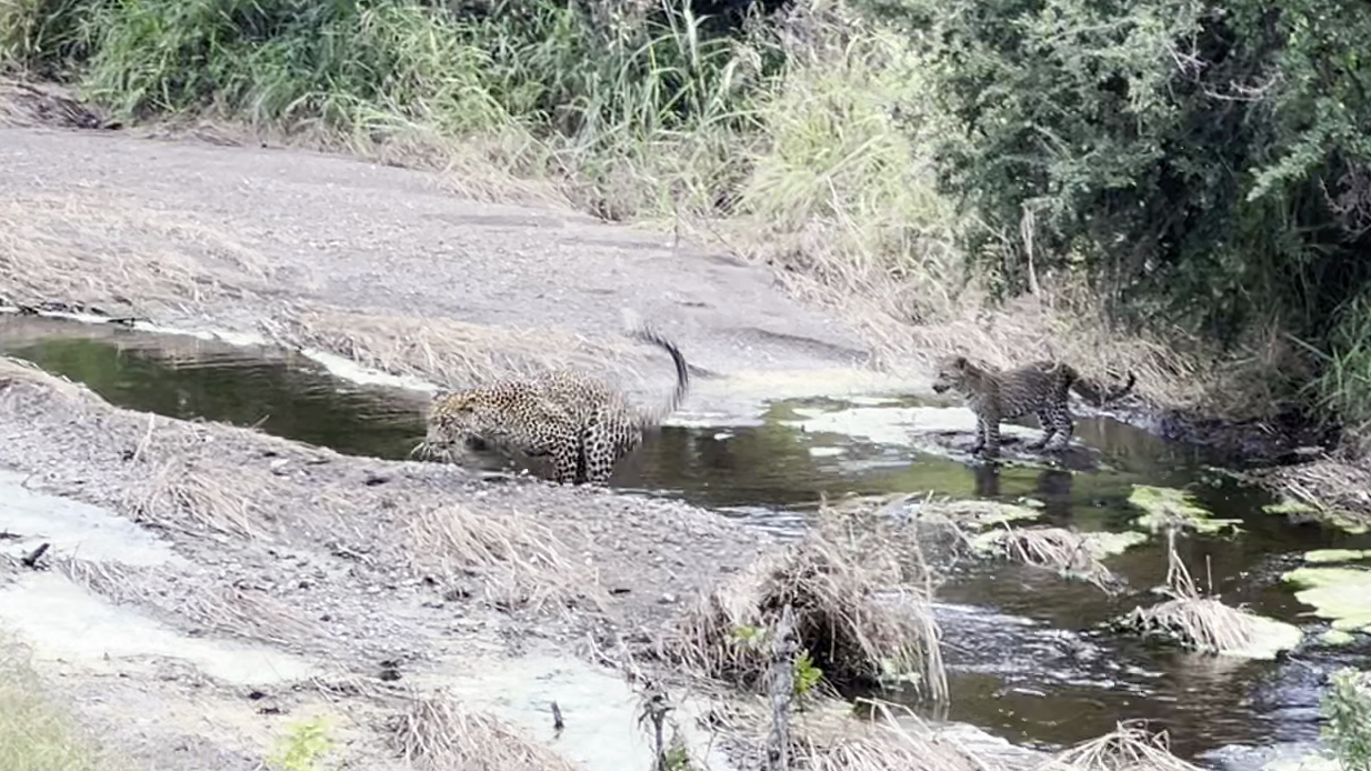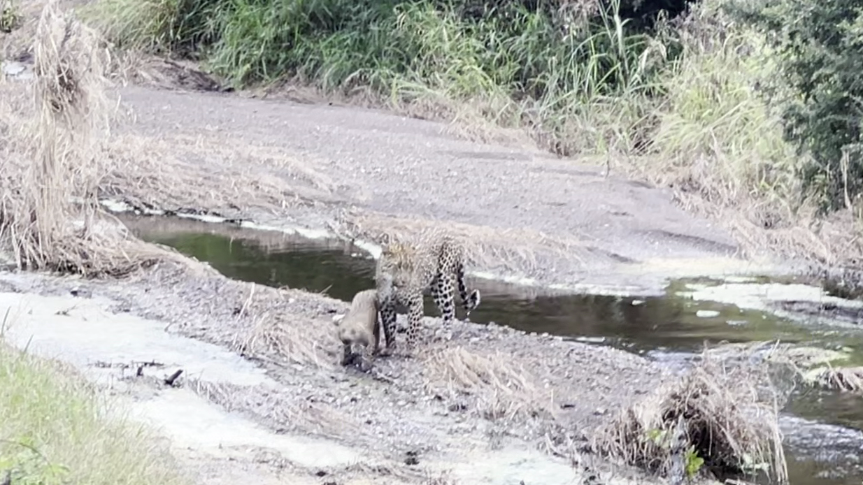 We join Mark and Olha as they marvel at the sight before them. A mother leopard and her cub are bonding on the side of a stream.