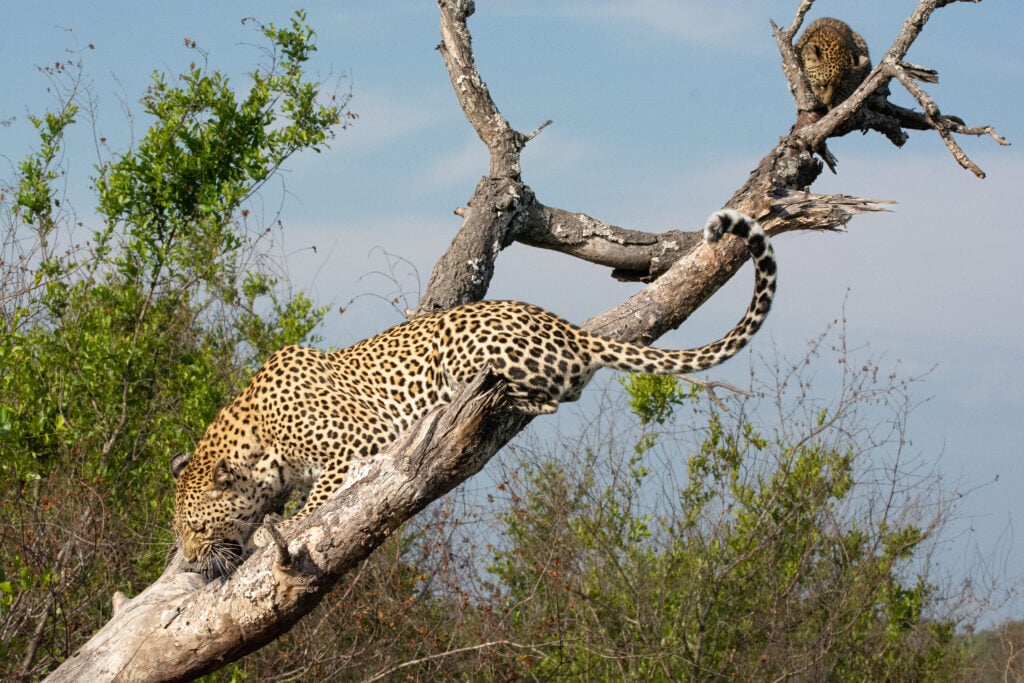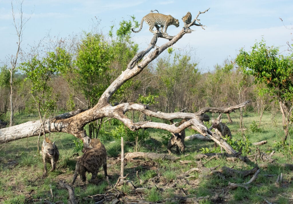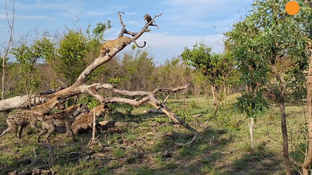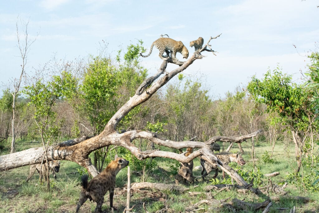 Although it wasn’t safe from them to come down, hyenas aren’t as capable climbers as leopards which meant the big cats were safe as long as they stayed high enough in the tree that they were out of reach.