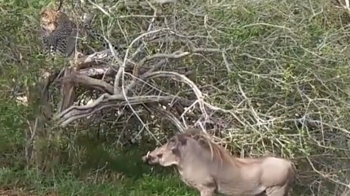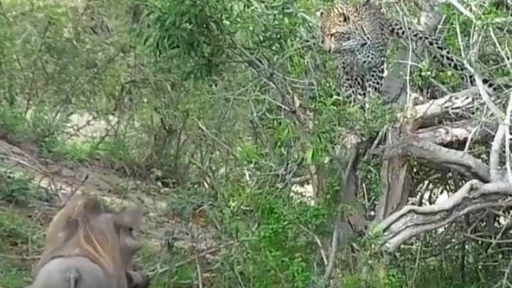 Hopefully the leopard wasn’t hungry, because it the warthog was going to keep it stuck in that tree until it decided to leave the area, and even then the leopard would need to wait a moment to make sure it was safe.