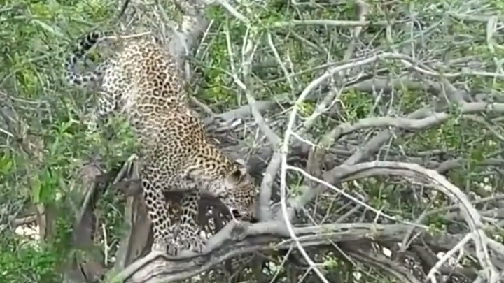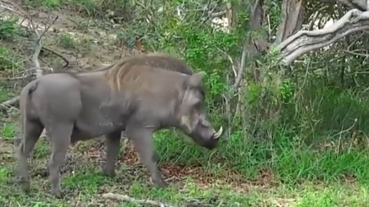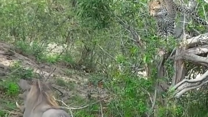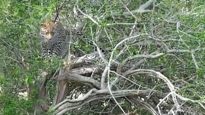 Sabi Sands saw a slight role reversal as a warthog took issue with the presence of a leopard, and ended up trapping it in the branches of a nearby tree. The leopard, which might have tried to hunt the hog under different circumstances, was clearly having a bad day.