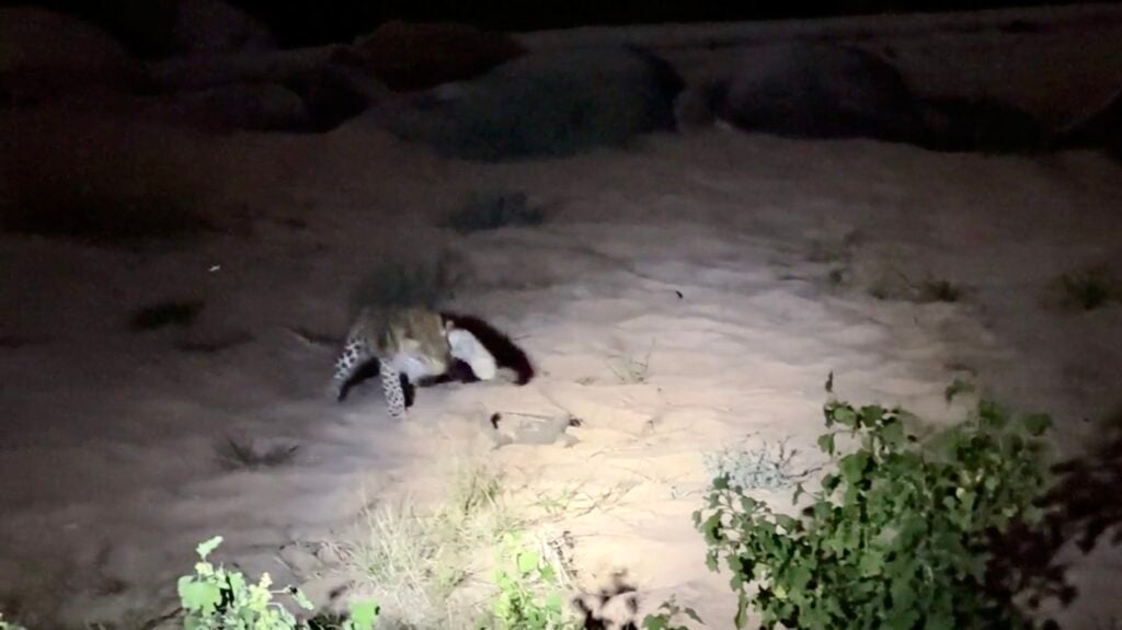 During a nighttime safari at Timbavati Nature Reserve, field guide Dean Robinson and his guests witnessed a thrilling and efficient strike by one of the most elusive big cats: the leopard.