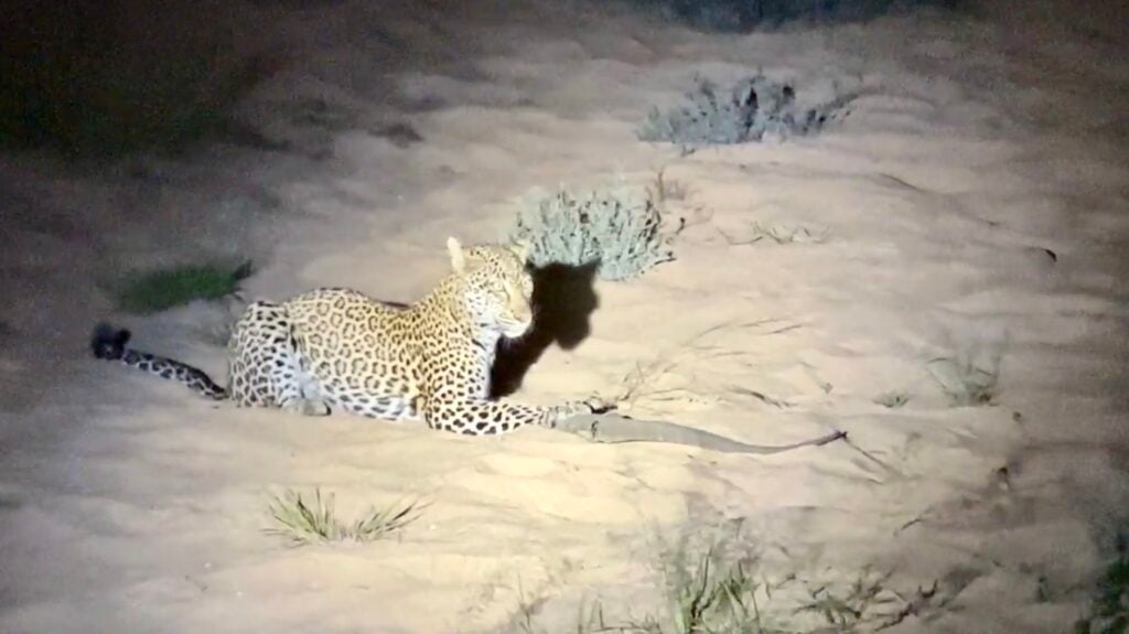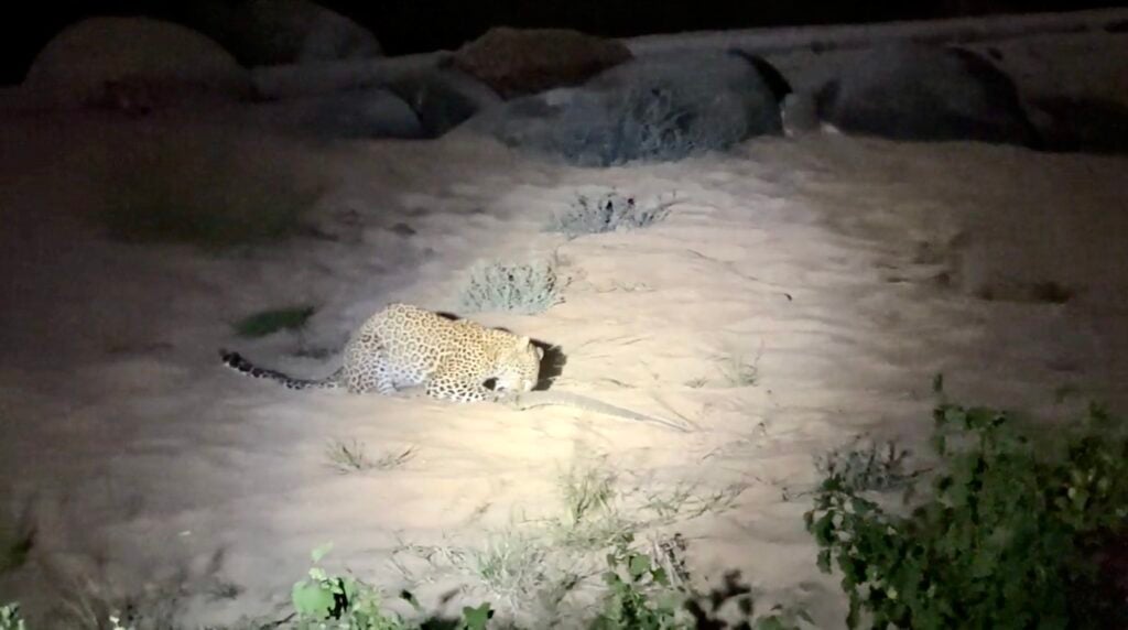 In the cover of darkness, the leopard spotted a monitor lizard creeping through the sand. Without hesitation, it attacked its newfound target!