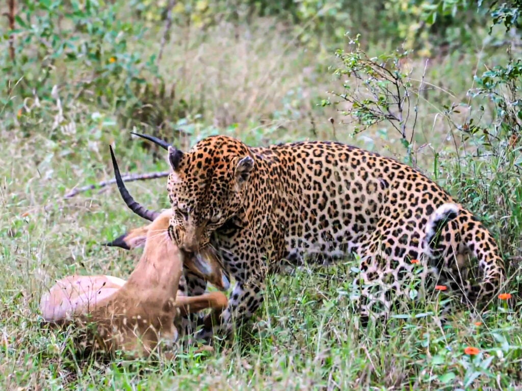 Leopards eat their prey in parts, often starting with softer internal organs and then moving on to the flesh. They may cover uneaten portions with leaves or grass to hide it from other predators. After feeding, they rest in trees or hidden spots nearby.
