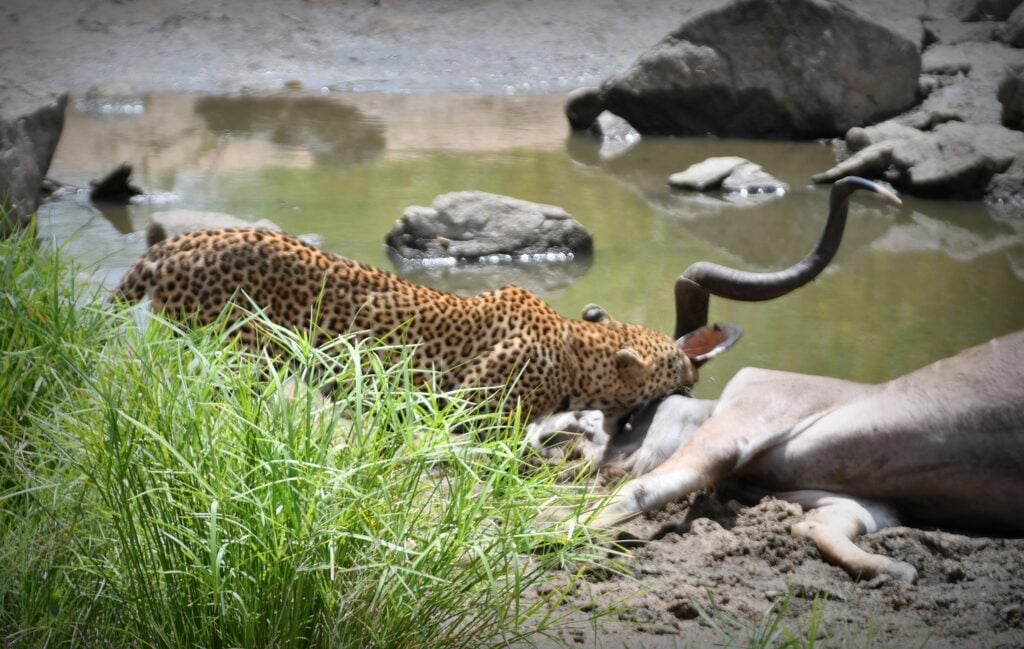 Size difference aside, it is clear that once the leopard sank its canines into the kudu’s throat, the antelope’s end followed shortly after.