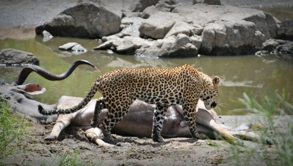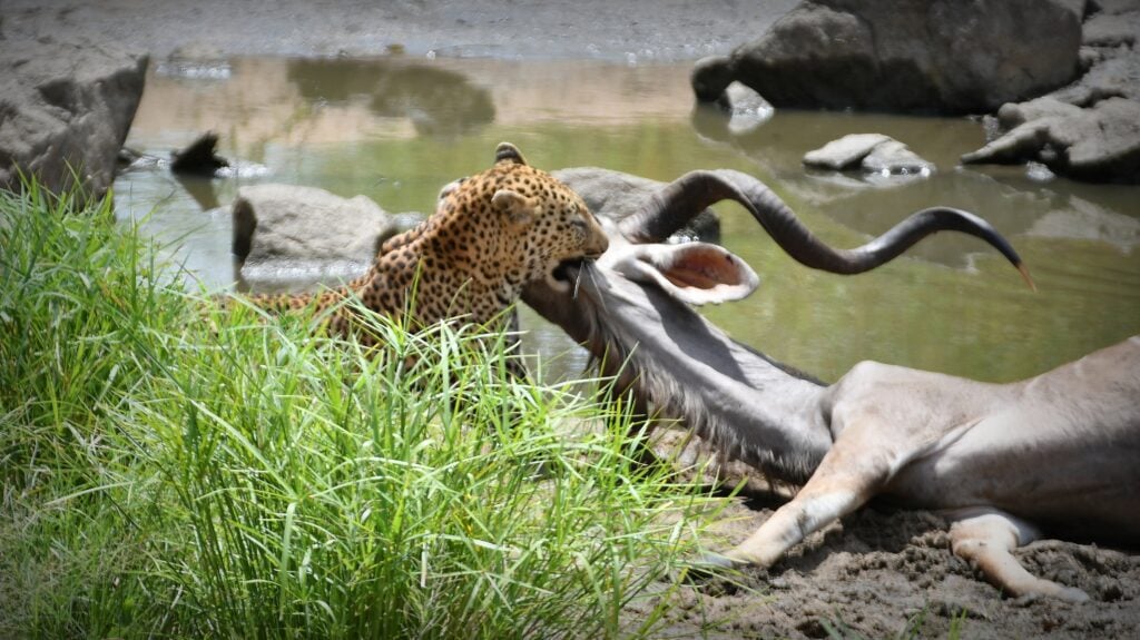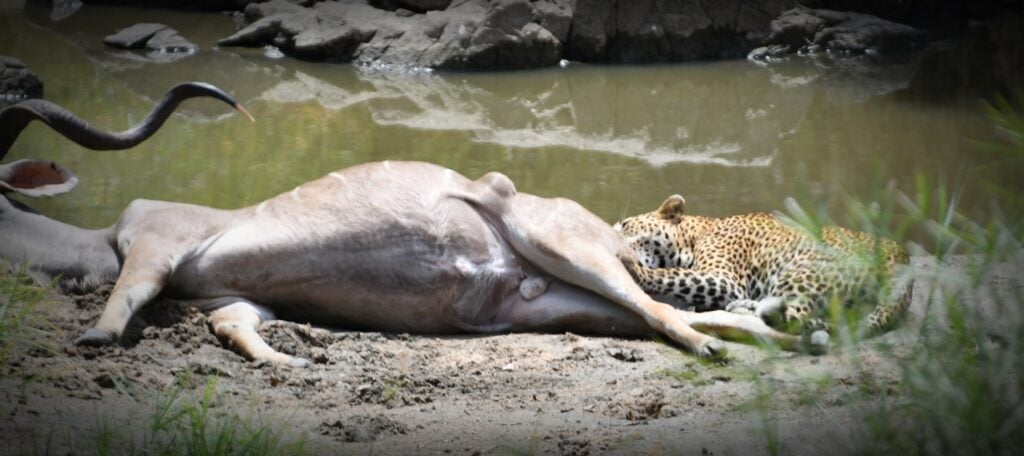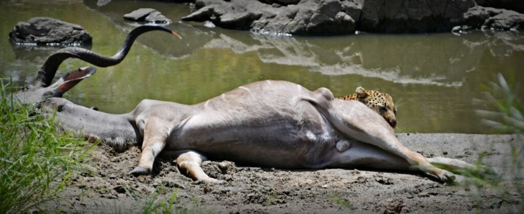 Needless to say, the kudu is too large for the leopard to attempt to hoist it up a tree, as it would with smaller prey.