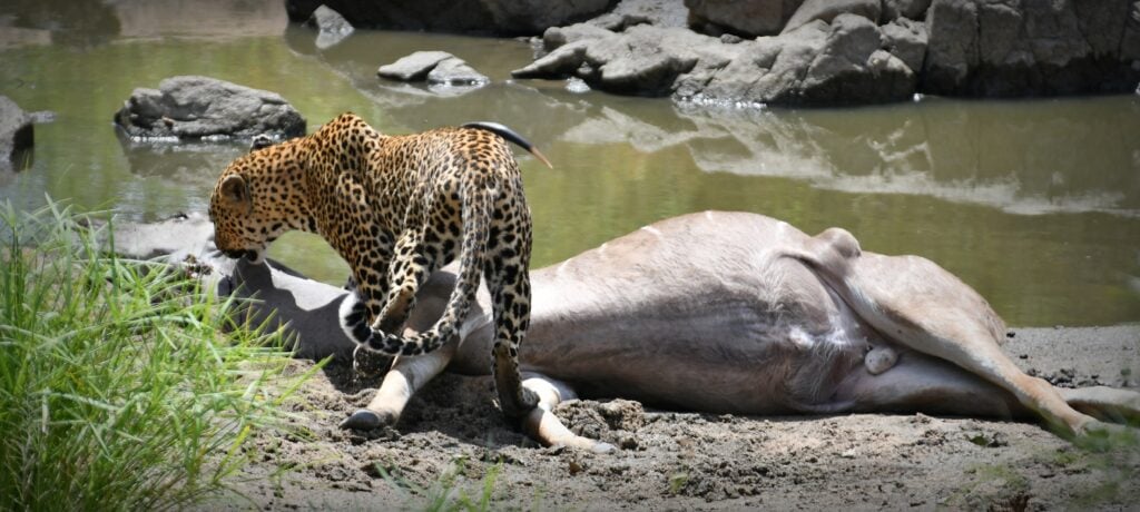 Having asphyxiated its prey, the leopard moved towards the antelope’s rear to begin feeding. Predators typically begin feeding in this area as it offers the easiest access to the prey’s innards.