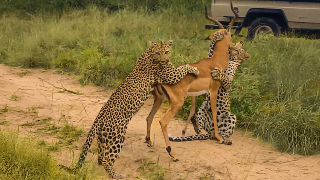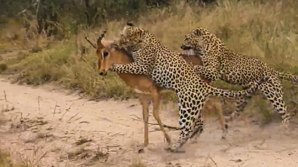 Unfortunately, the video comes to an end before we find out whether or not the impala survived. Or, for that matter, whether the leopards got their hard-earned meal.