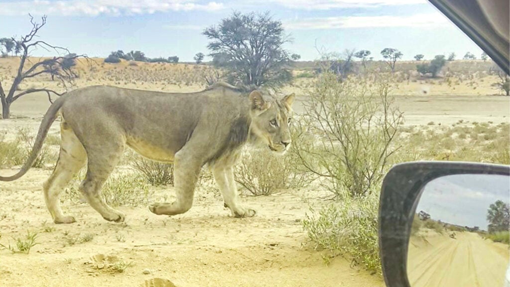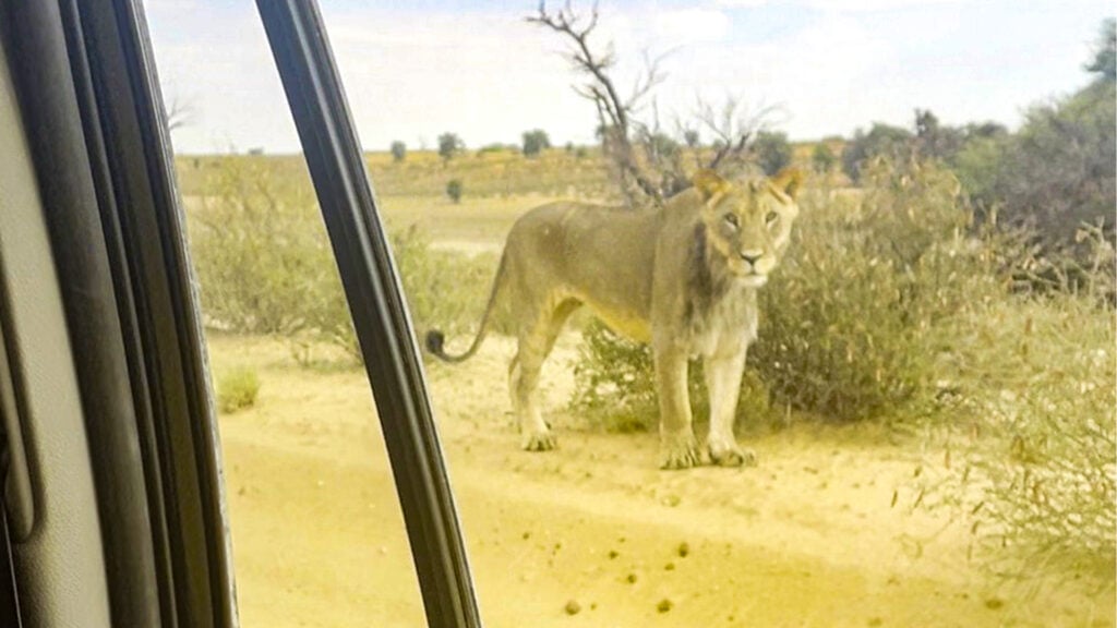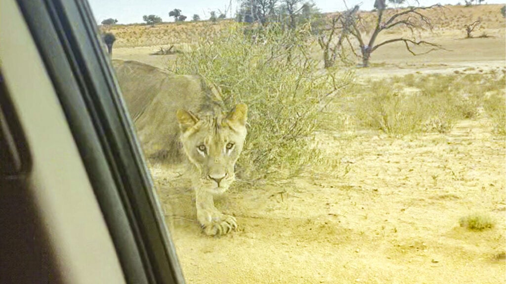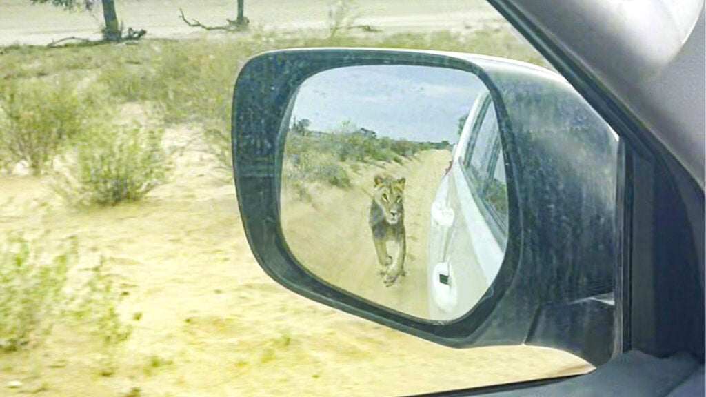 Dave’s car slowly advances so that it travels parallel to the lion. Meanwhile, the lion casts sideways glances, clearly aware of the vehicle’s presence but seemingly unbothered.