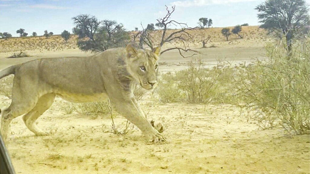 This dramatic sighting was filmed in the arid wilderness of Kgalagadi Transfrontier Park by Dave Elston. Dave’s footage begins calmly, with his car stopped on a dirt road while he films from inside the vehicle.