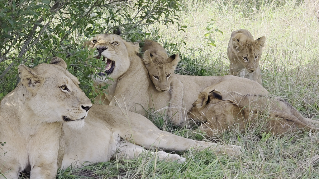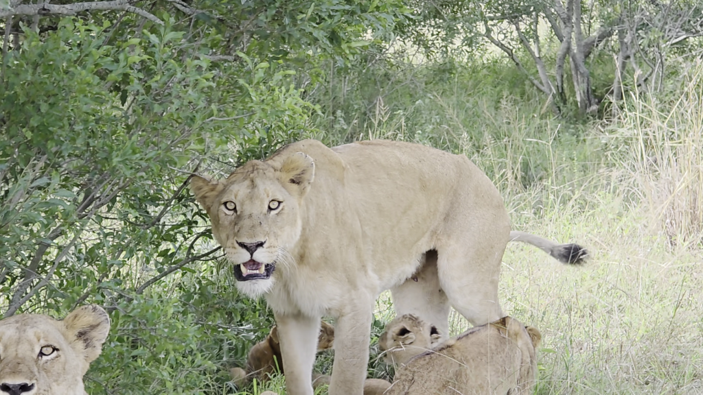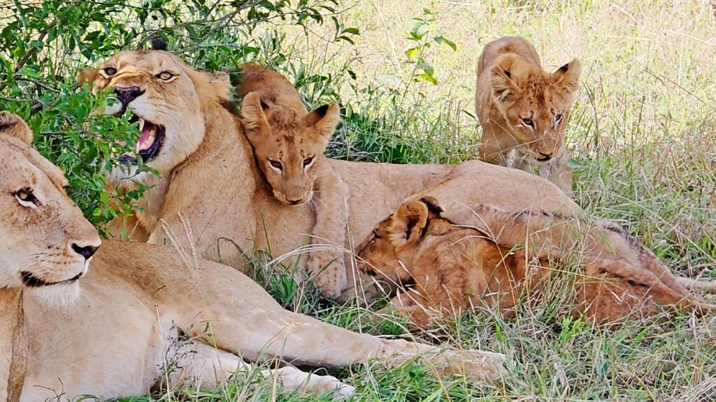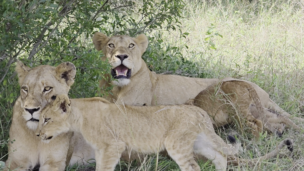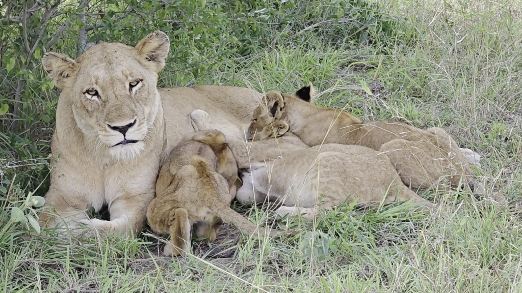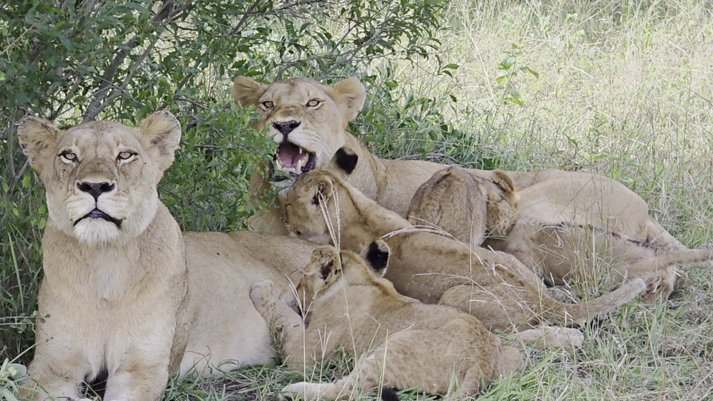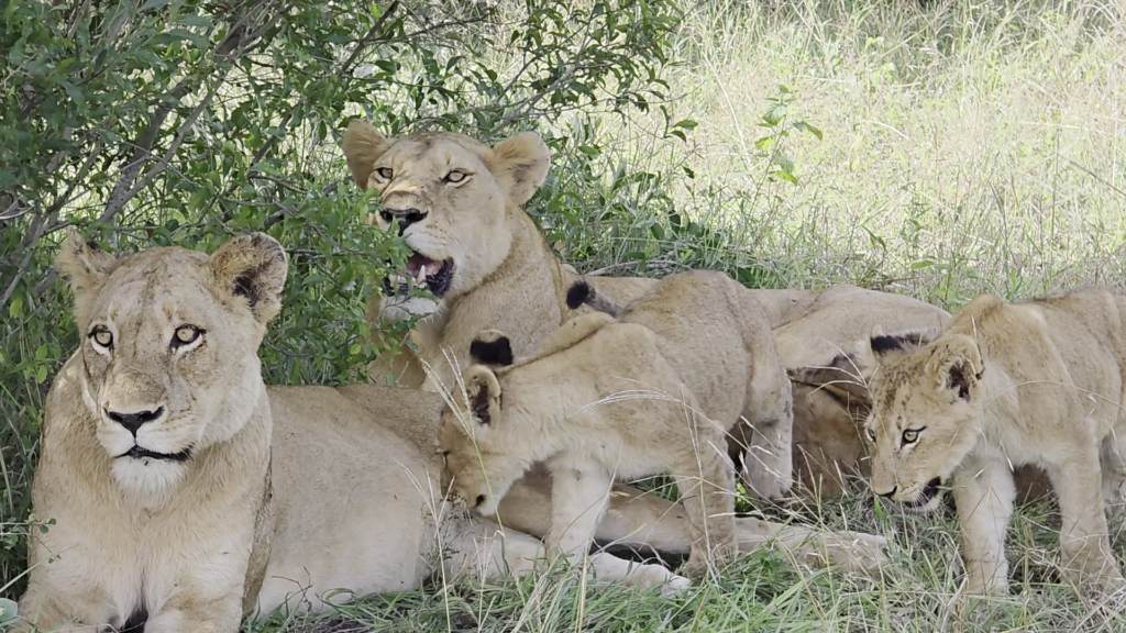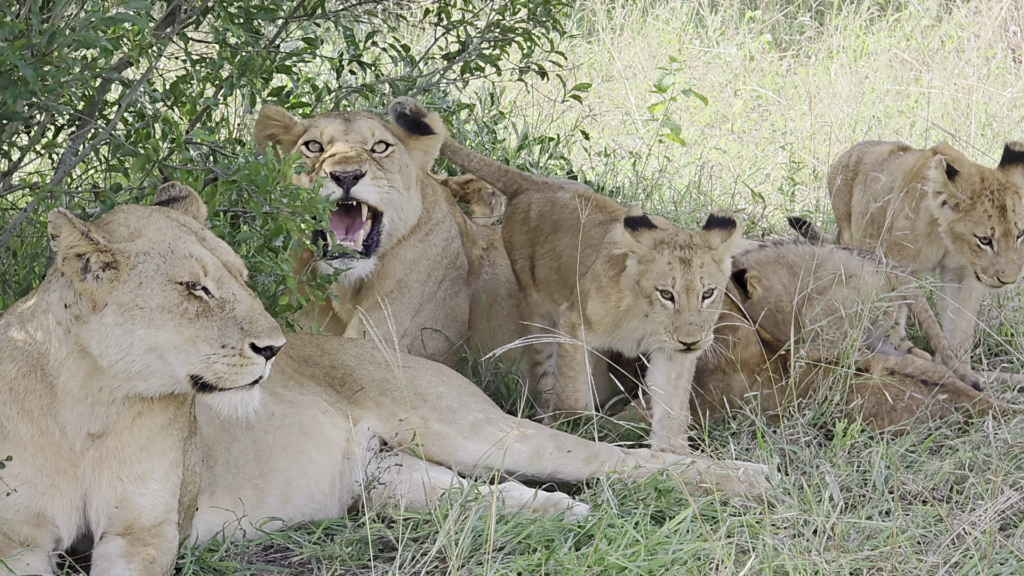 As the video rolls, a pair of lionesses appears with numerous cubs clambering about them. By the looks of it, the lionesses have just settled after returning from a hunting expedition.