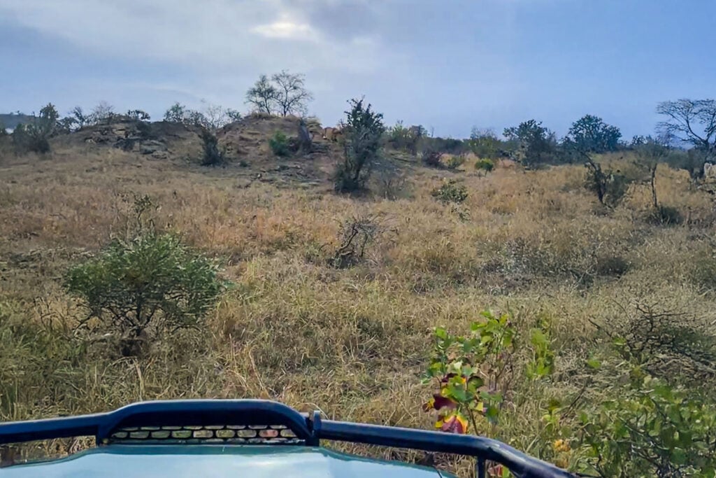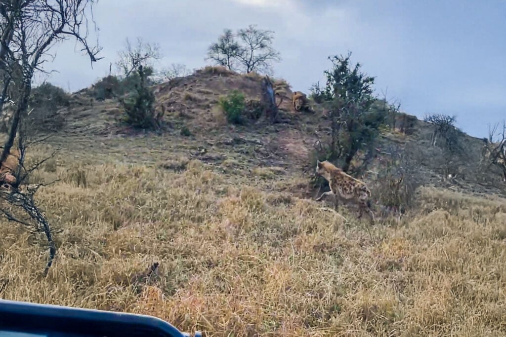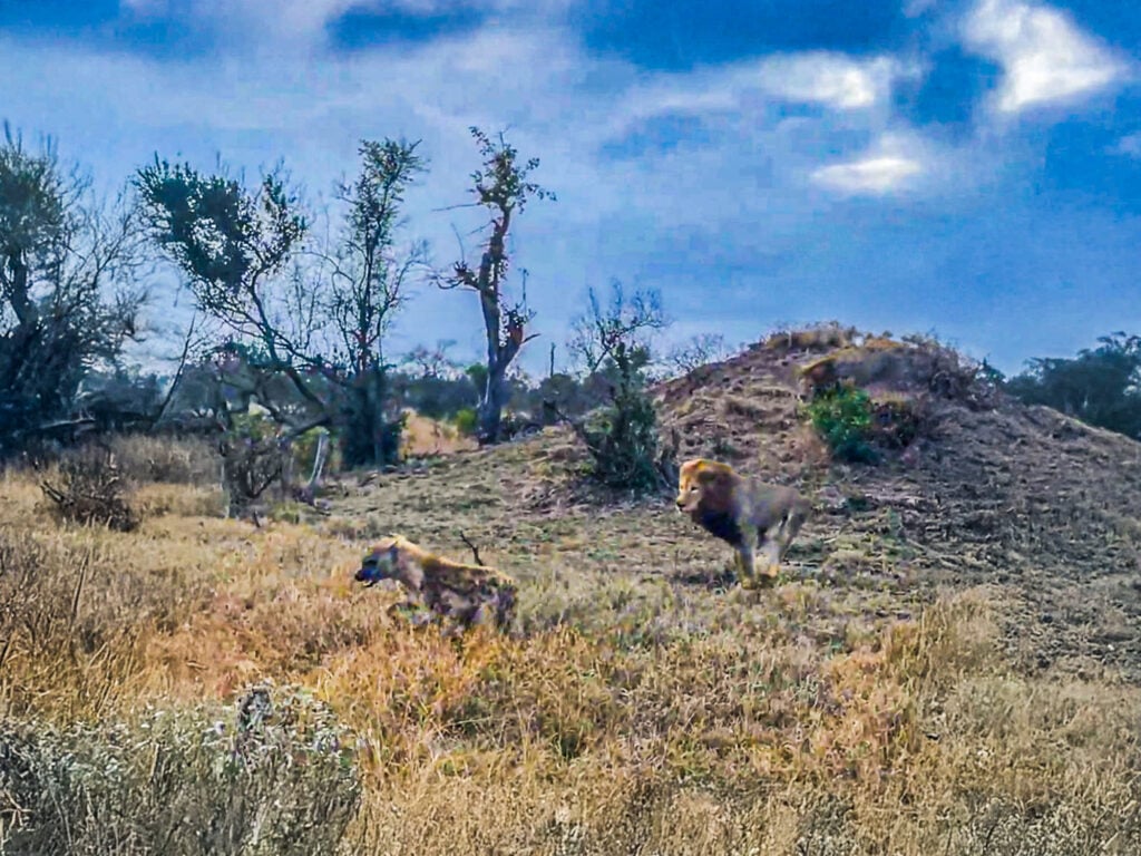 There were no warning trumpets for the hyena. Only the spectators saw the lion in the distance, relatively well camouflaged as the hyena took a leisurely stroll across the rugged bushveld terrain.