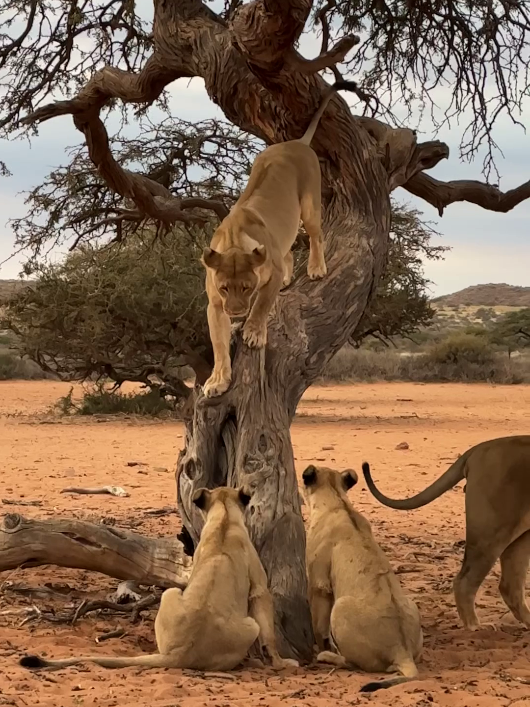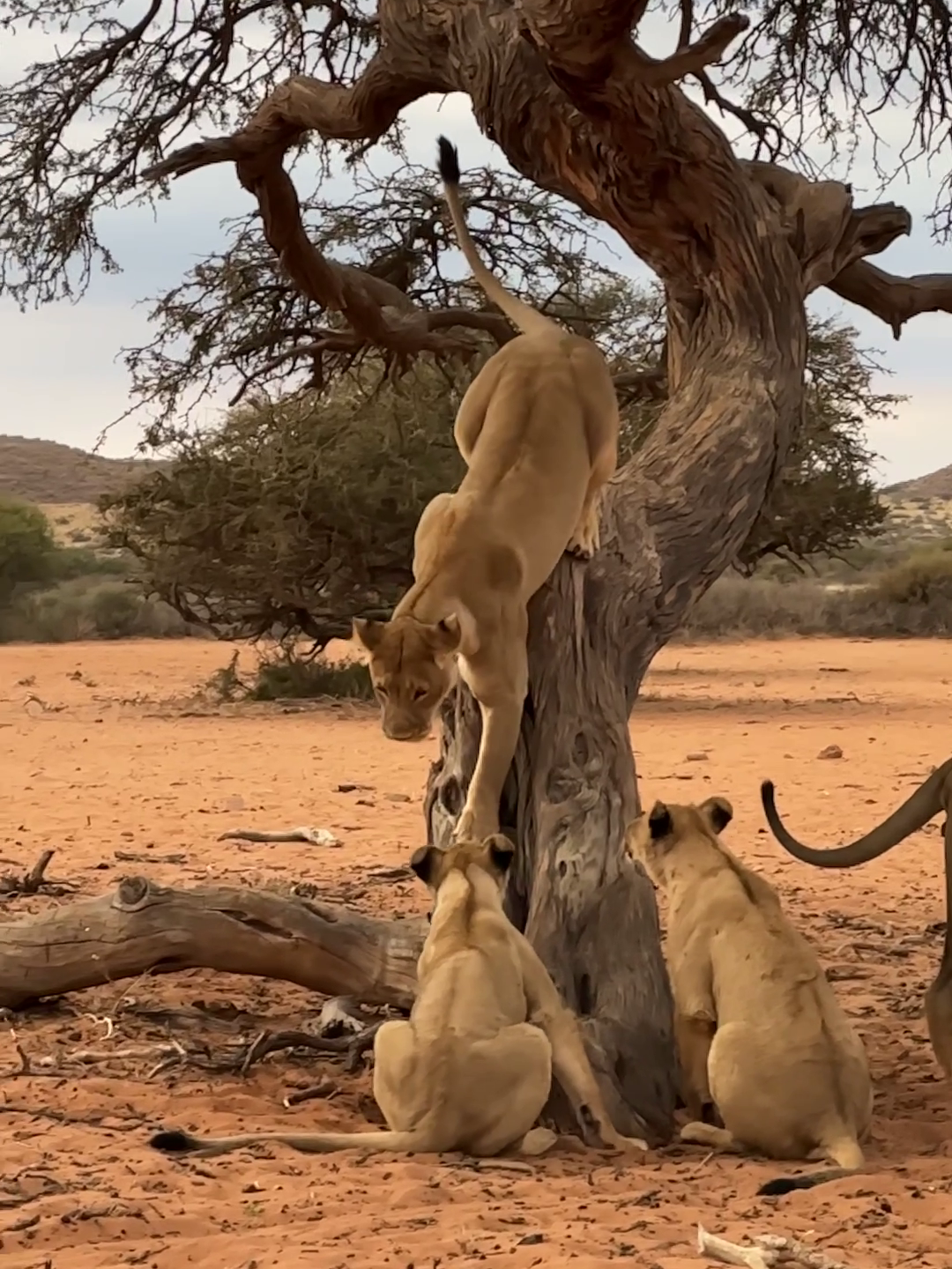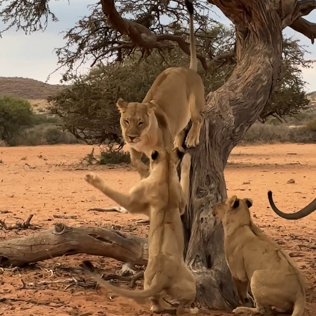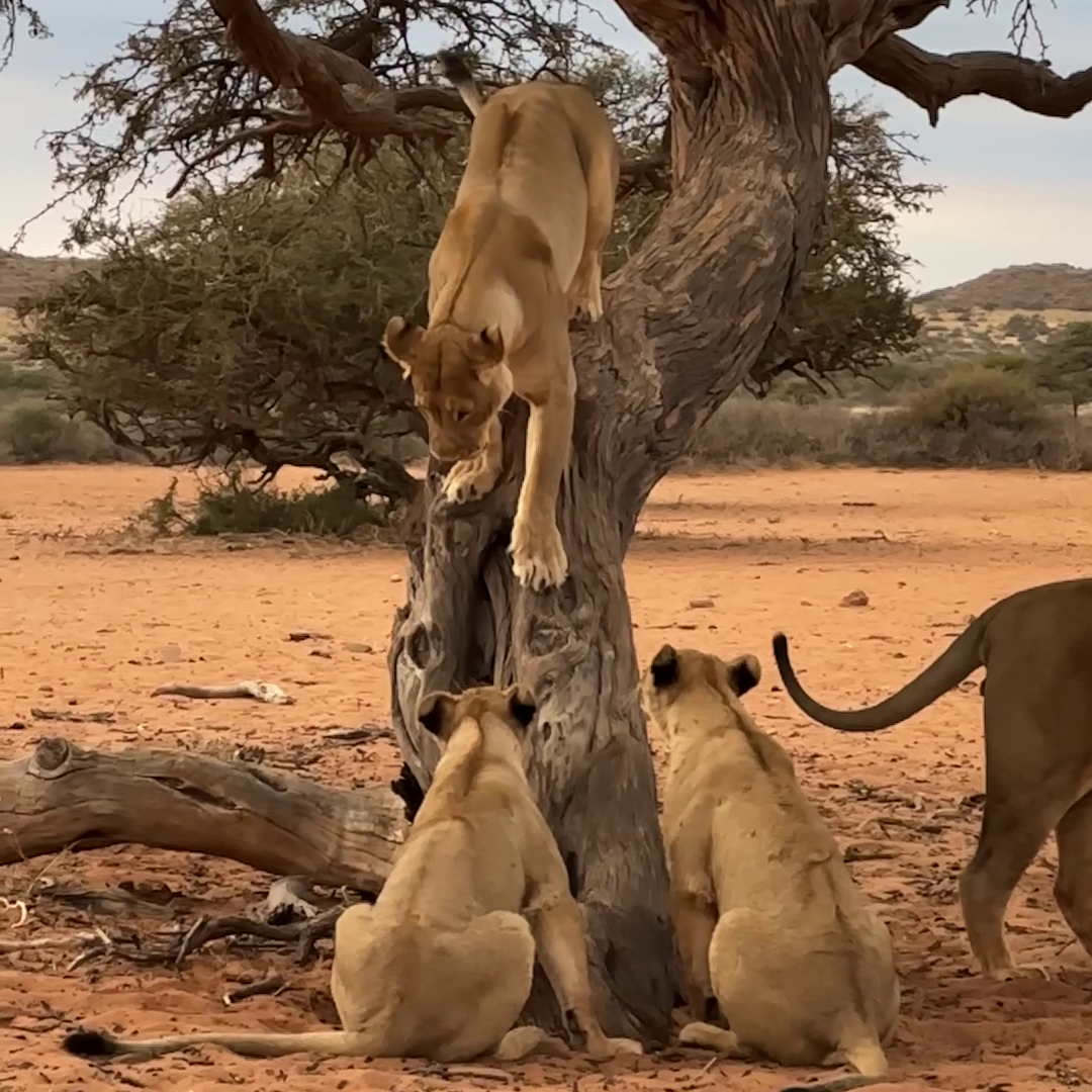 As she inches down the steep trunk, you can see the cubs’ bodies shuffle with excitement. With eyes and ears intensely focused on the descending lioness, we get the sense that this is more than just observation.