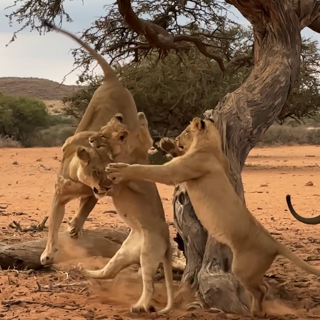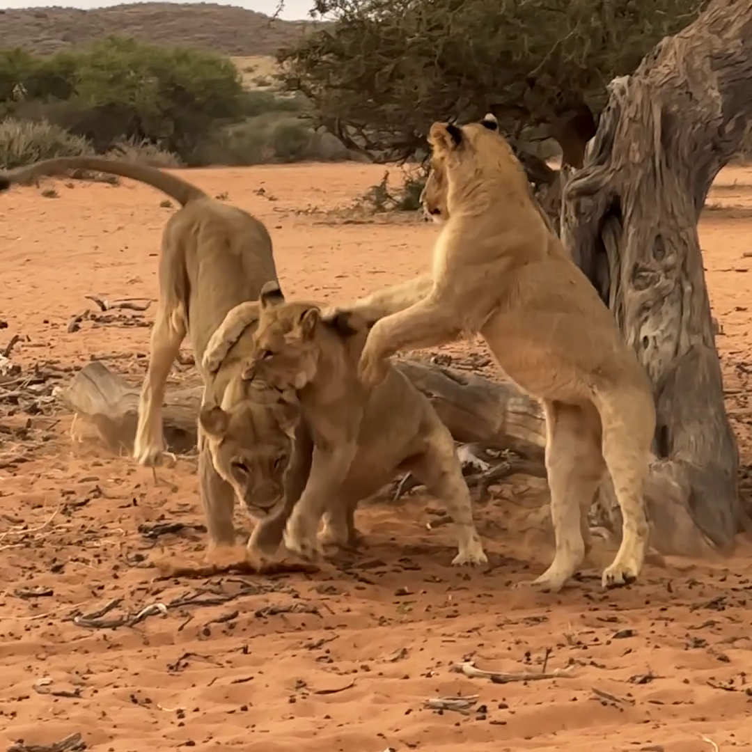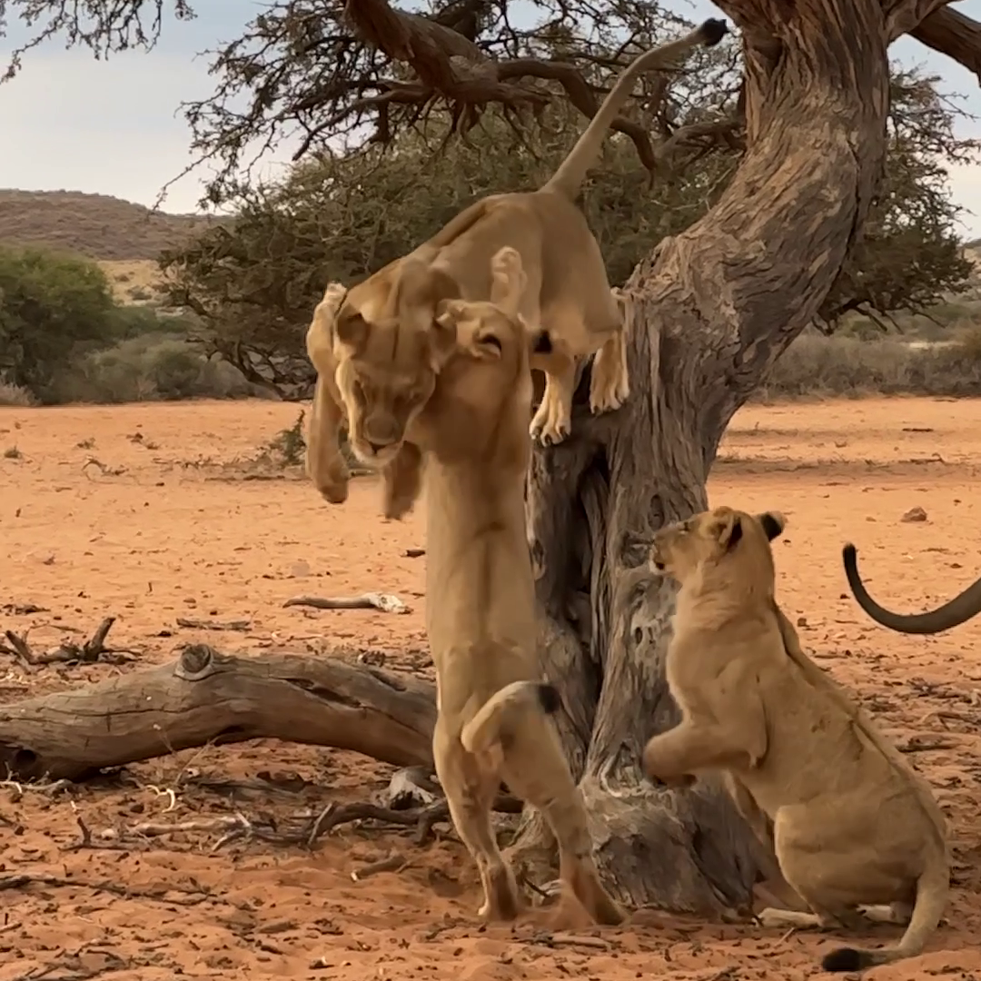 Precisely at the moment the lioness jumps, the cub launches its “attack”. With gravity now in control, the lioness has no choice but to fall into the youngsters’ waiting paws.