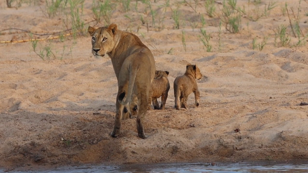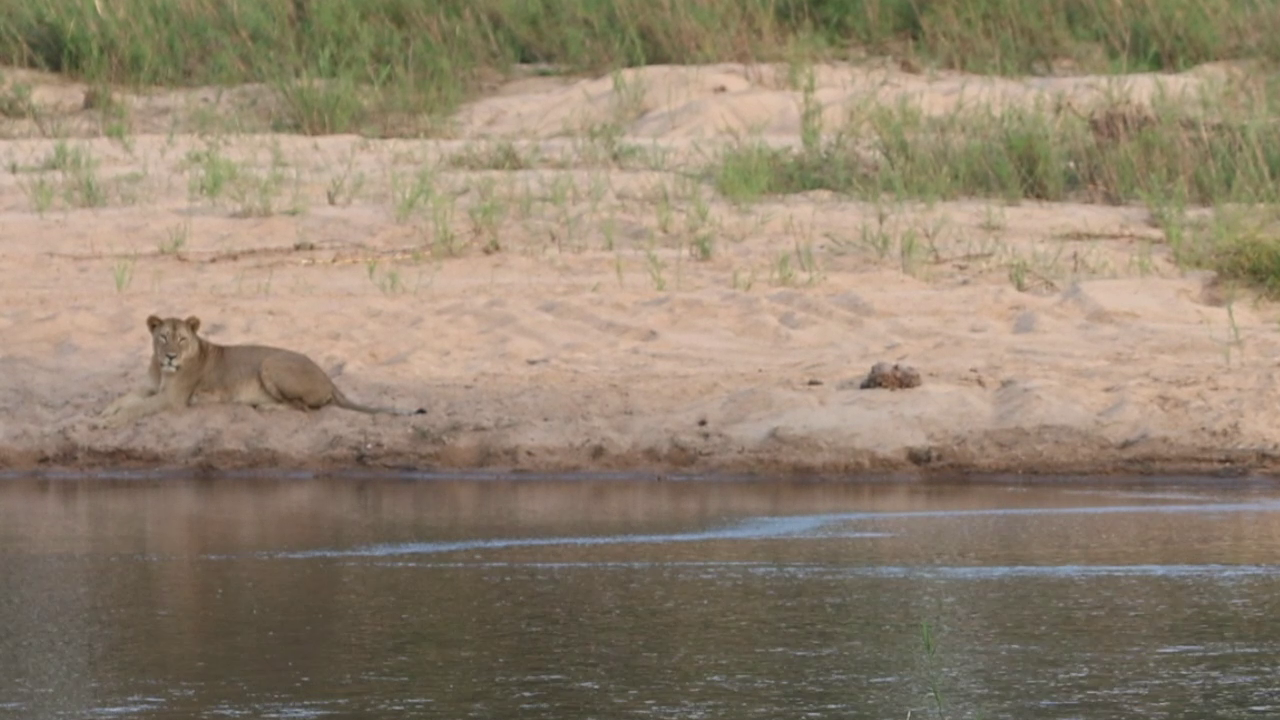 The video opens to a placid scene, giving no clue of the drama about to unfold. A lone lioness gazes towards the camera while resting on the bank of the Sand River.