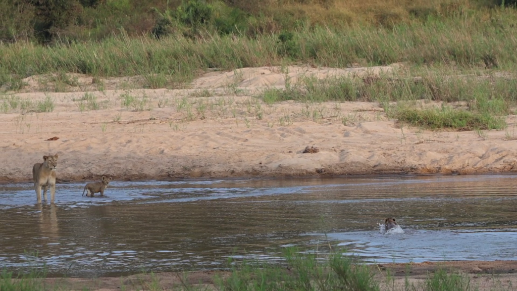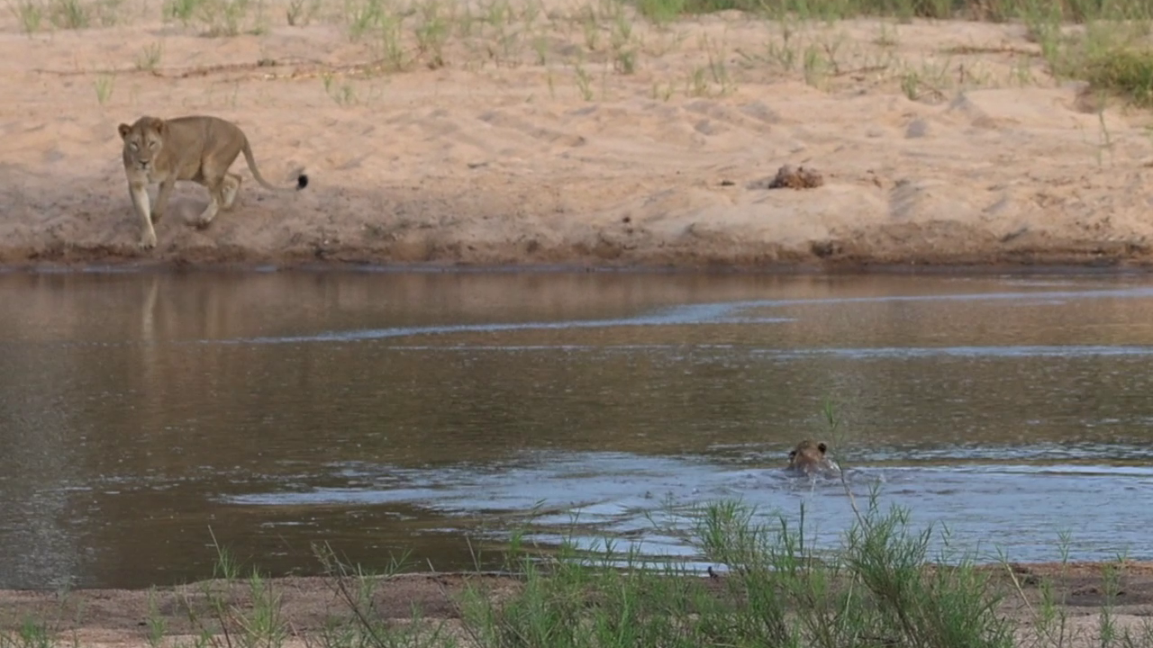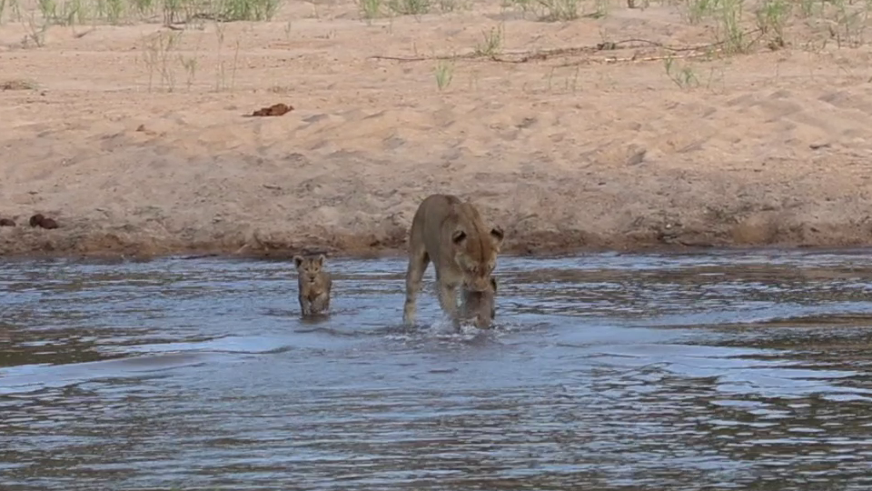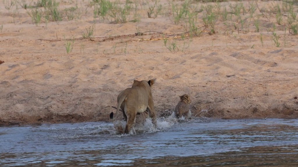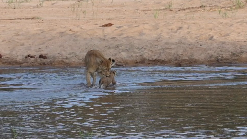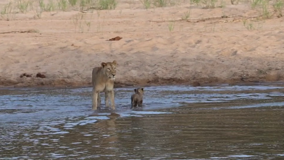 Thankfully, as the lioness wades into the shallows, her little one makes good progress. As it does, she calls softly to it, encouraging it not to give up.