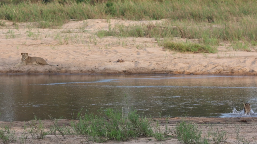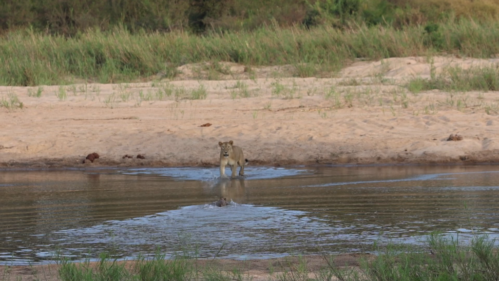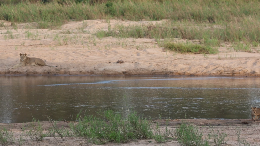 Helped by David’s commentary, we piece together what has happened. The lioness crossed the river ahead of the cub, and she is now waiting for it to follow her.
