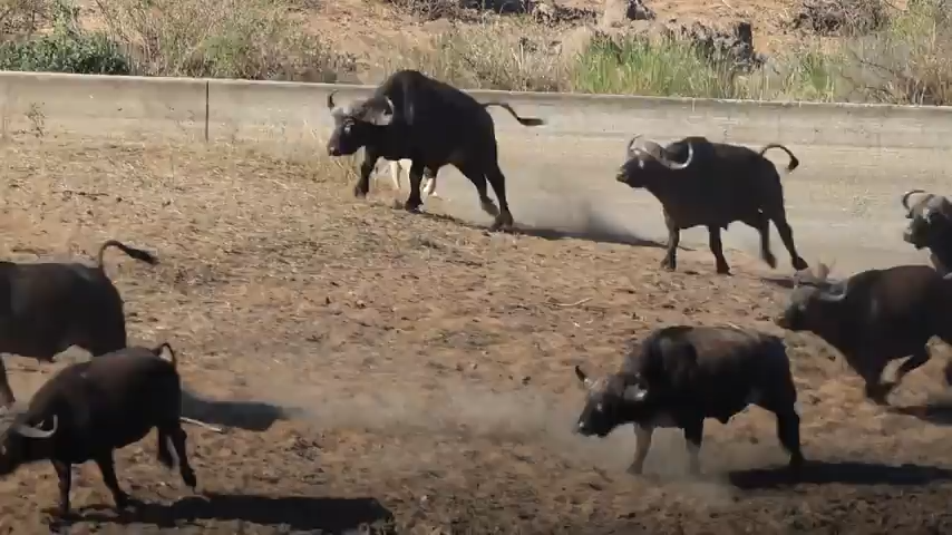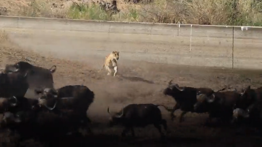 Unfortunately for the lioness, none of the buffalo appeared to be flagging behind the others, and they were running in a formation so closely packed in together that the big cat couldn’t find an opening.