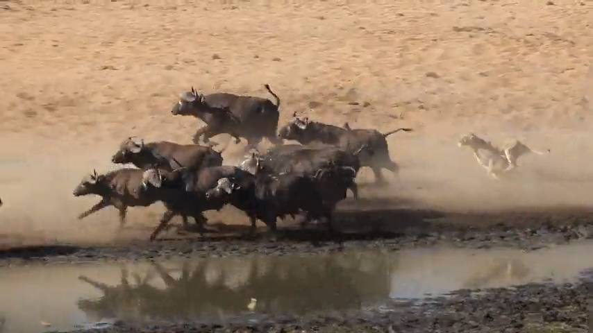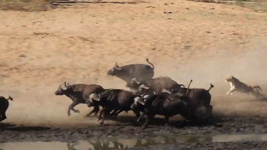 With them all running so closely together, any attempt the lion made to attack the haunches of one buffalo came with the significant risk of another one trampling her beneath its feet.