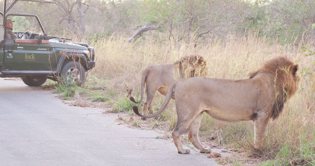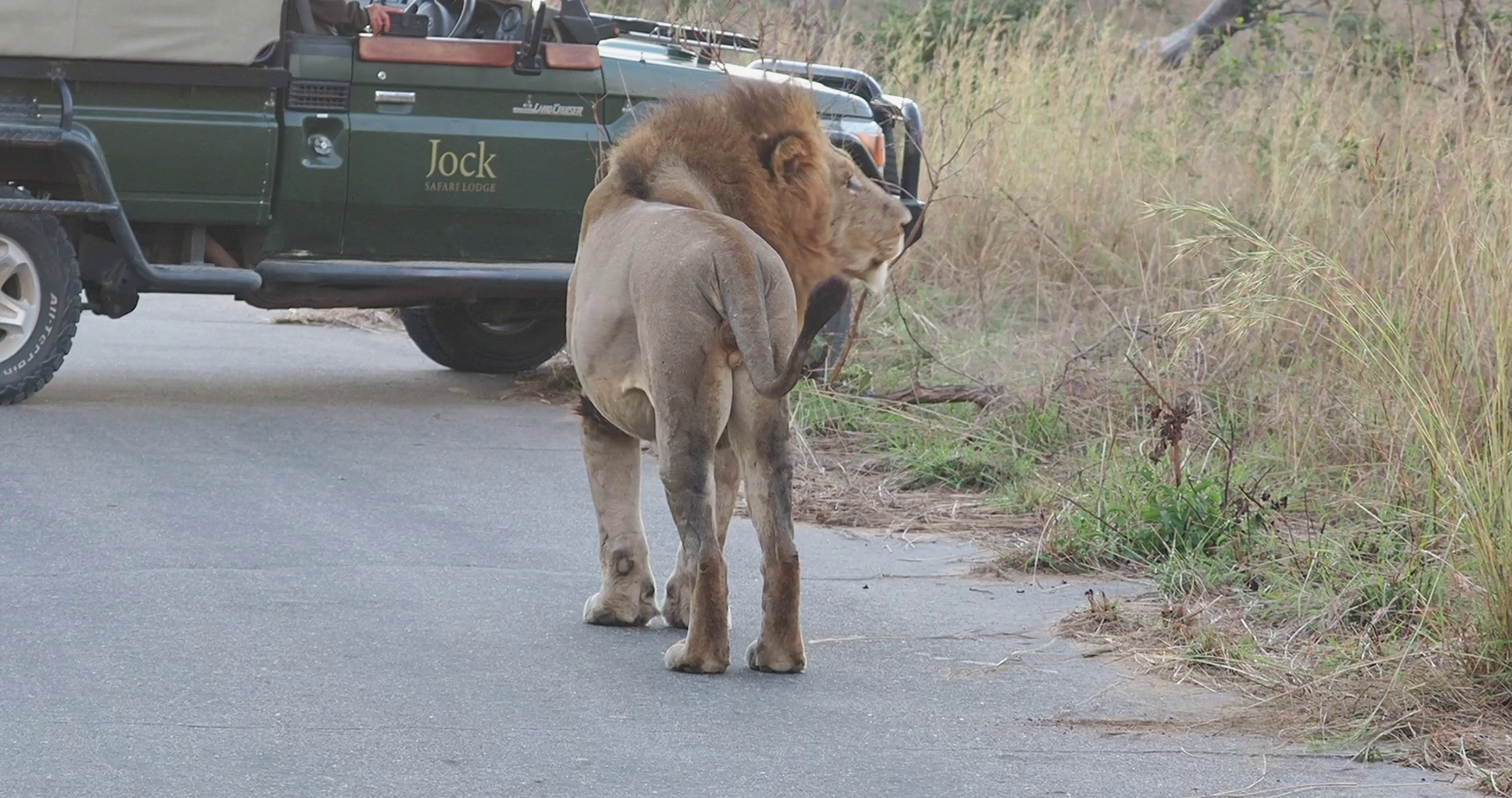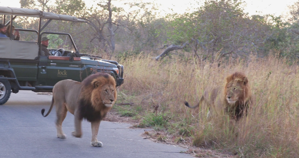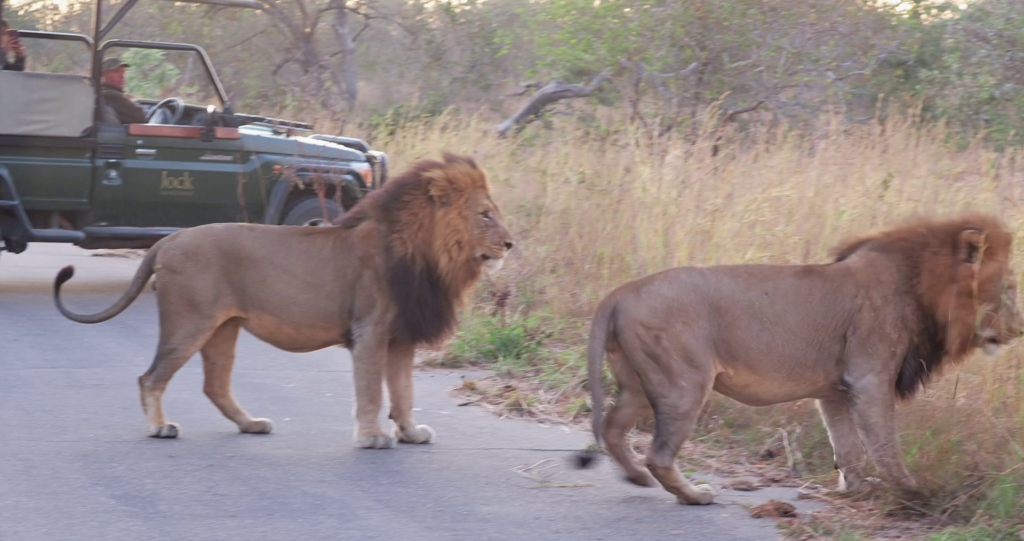 Instead of following the lioness into the long grass, the brothers start walking side by side along the road. Male lions often form close bonds with one another, allowing them to secure larger territories and more females to mate with.