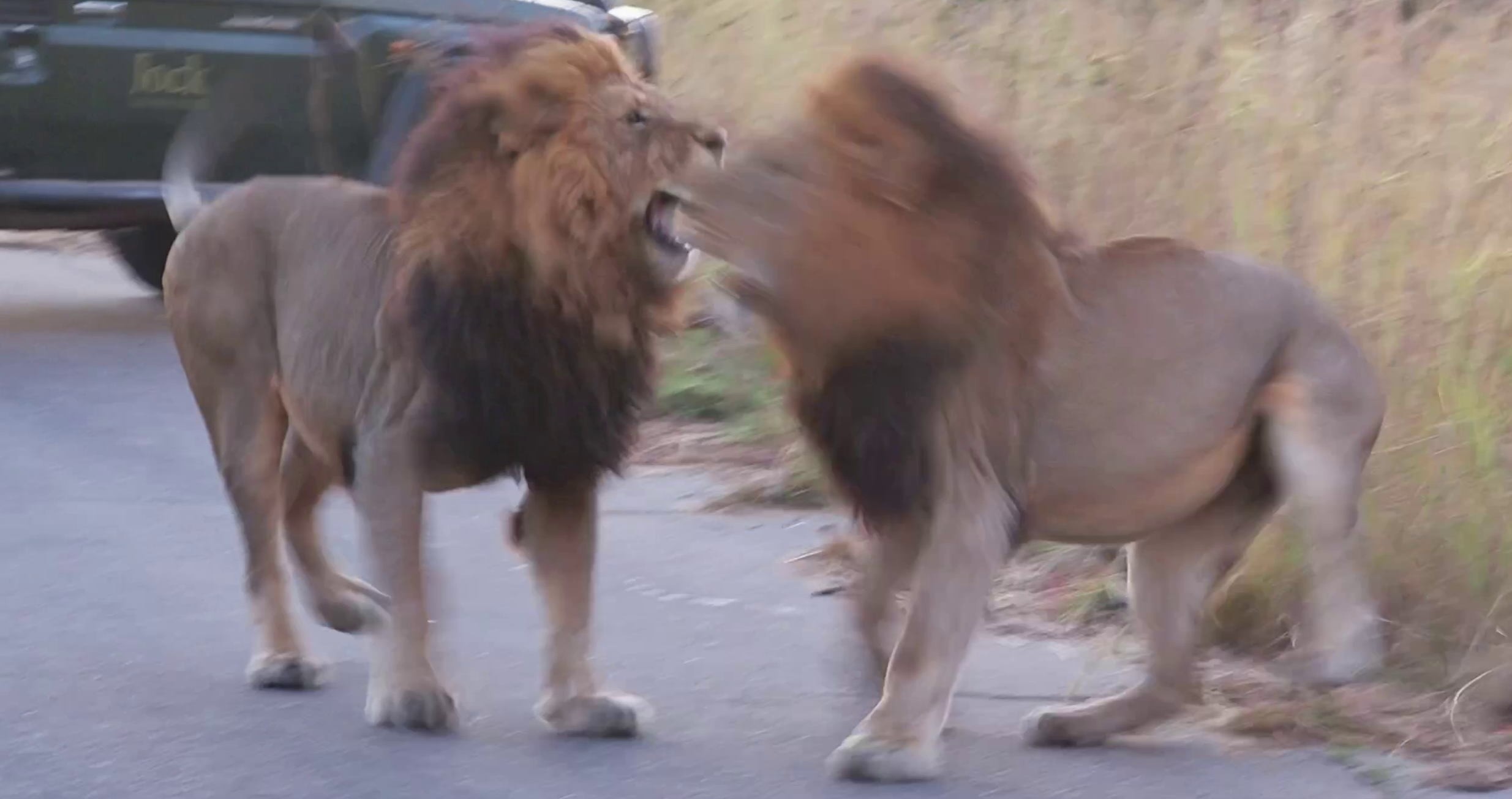 Joining the action in this dramatic video, we first see a magnificent pair of male lions strutting across a road. As they advance, we catch a glimpse of a lioness disappearing into the long grass behind them.