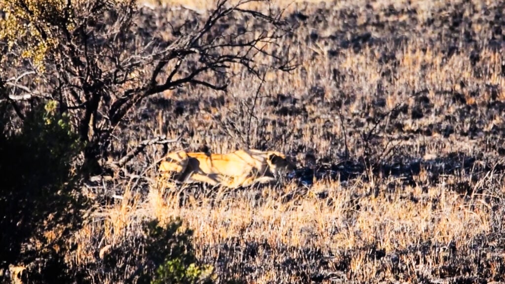 As Christo’s video begins, we see a lioness lying close to the ground in a landscape recently burnt by fire.