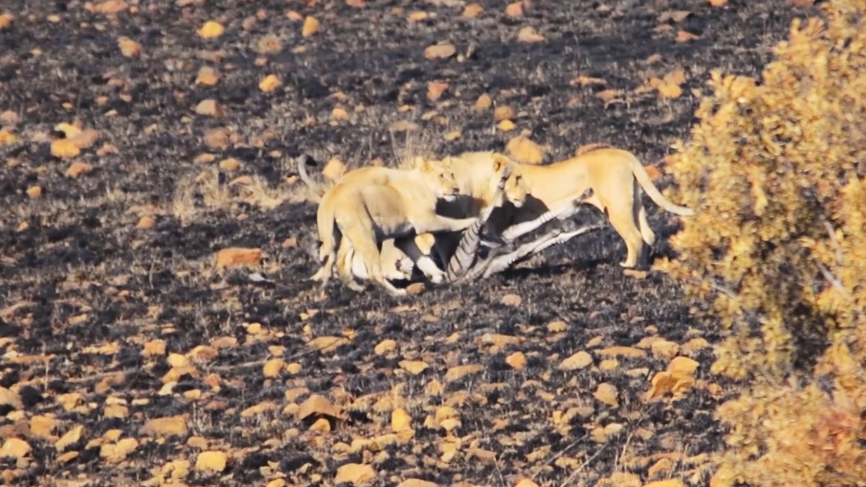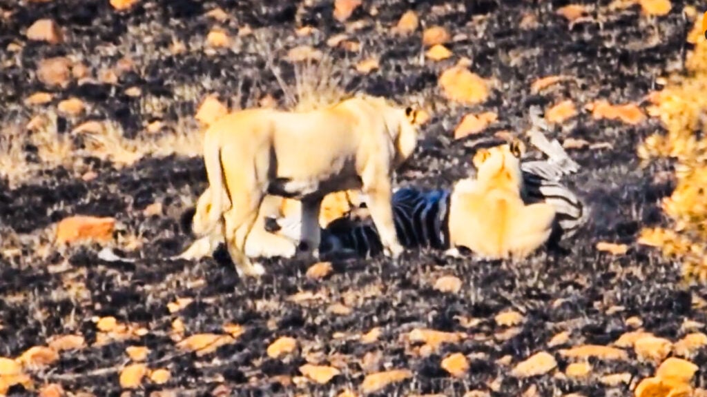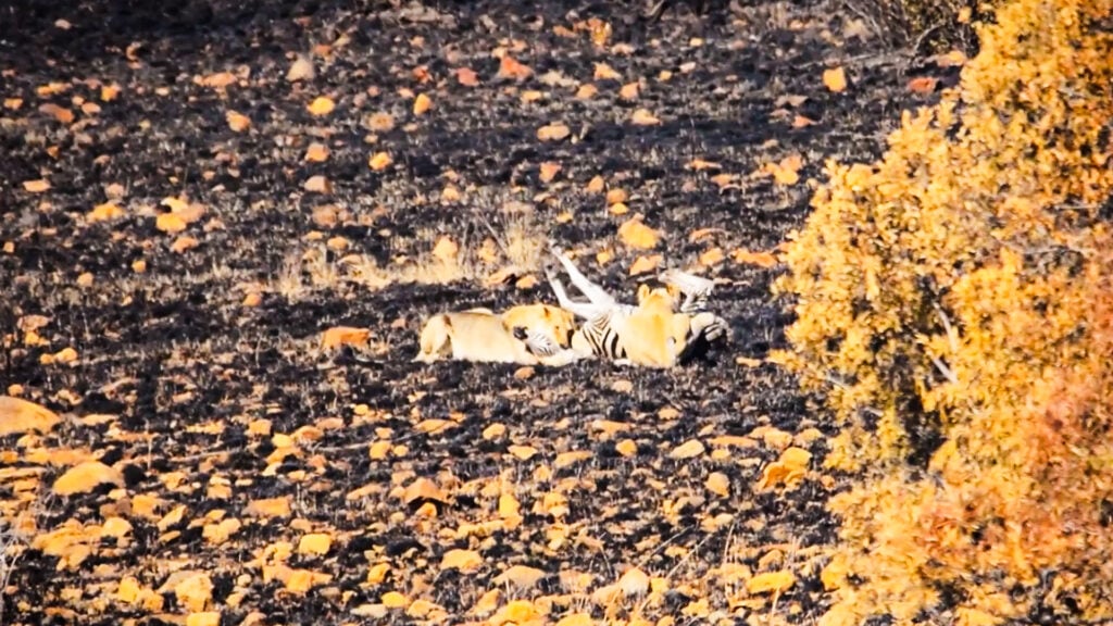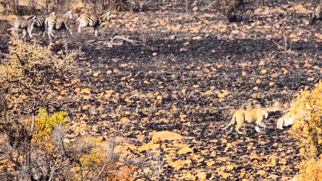 Subsequently, the video cuts to a new scene. In it, we see a young zebra walking across the same fire-scarred landscape. This is what the lioness was watching.