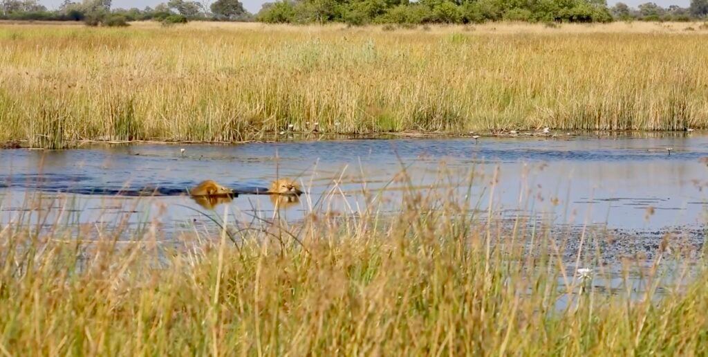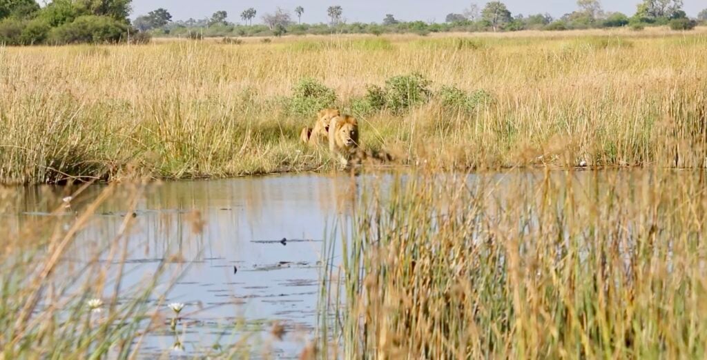 Then, without pause, the lions continued their journey into the tall grass, leaving behind nothing but ripples in the water.